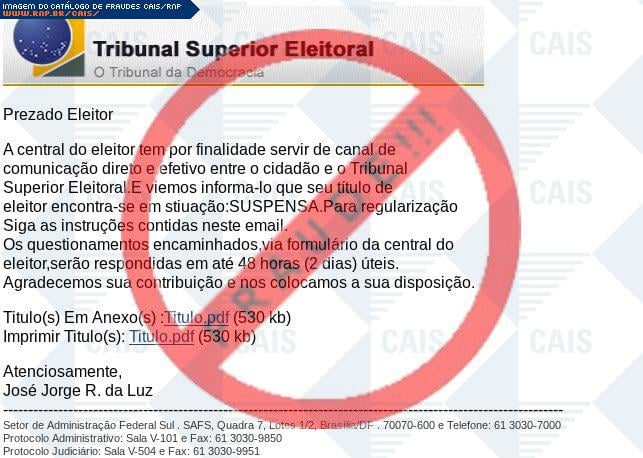 | comentário | A falsa mensagem se passa pela notificação do STE sobre o possível cancelamento do título de eleitor da vítima. Os links da mensagem realizam o download de um arquivo malicioso que pode danificar o computador do usuário ou furtar dados pessoais. | |