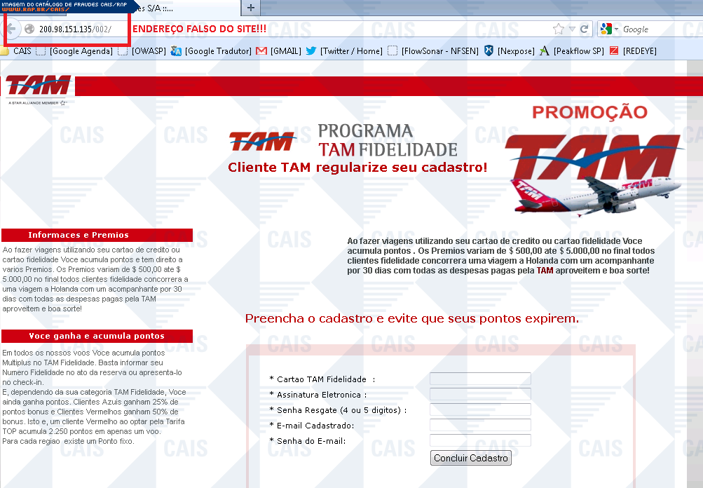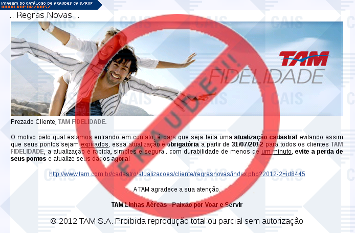 | comentário | A falsa mensagem informa o usuário que é necessário a atualização cadastral junto ao site da companhia para que seus pontos no programa de vantagens não expirem. O link da mensagem direciona para um site falso que tem o objetivo de roubar dados e/ou danificar... (leia mais) | |