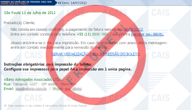 | comentário | A falsa mensagem em nome do escritório "Albino Advogados Associados", circulando desde o início do mês de Julho/2012, notifica o usuário sobre a necessidade de pagamento de um suposto boleto de cobrança. O link da mensagem realiza o download de um arquivo... (leia mais) | |