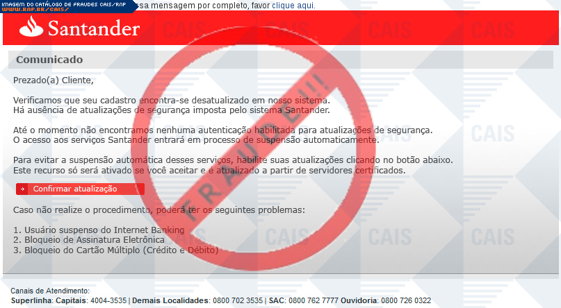 Esta página tem função informativa e educativa. Exibe uma coleção de imagens de phishing scam (fraudes eletrônicas) ou malware (código malicioso) veiculados por meio de spam (e-mail não-solicitado). Trata-se de conteúdo exemplificativo, não exaustivo, uma vez que não é possível contemplar todos os casos de fraudes existentes. Assim, caso você tenha conhecimento de um exemplar que não esteja aqui presente, isto não significa que não seja válido ou real. Inclusive incentivamos que você o envie para análise do CAIS para que, se for o caso, passe a integrar o nosso acervo.