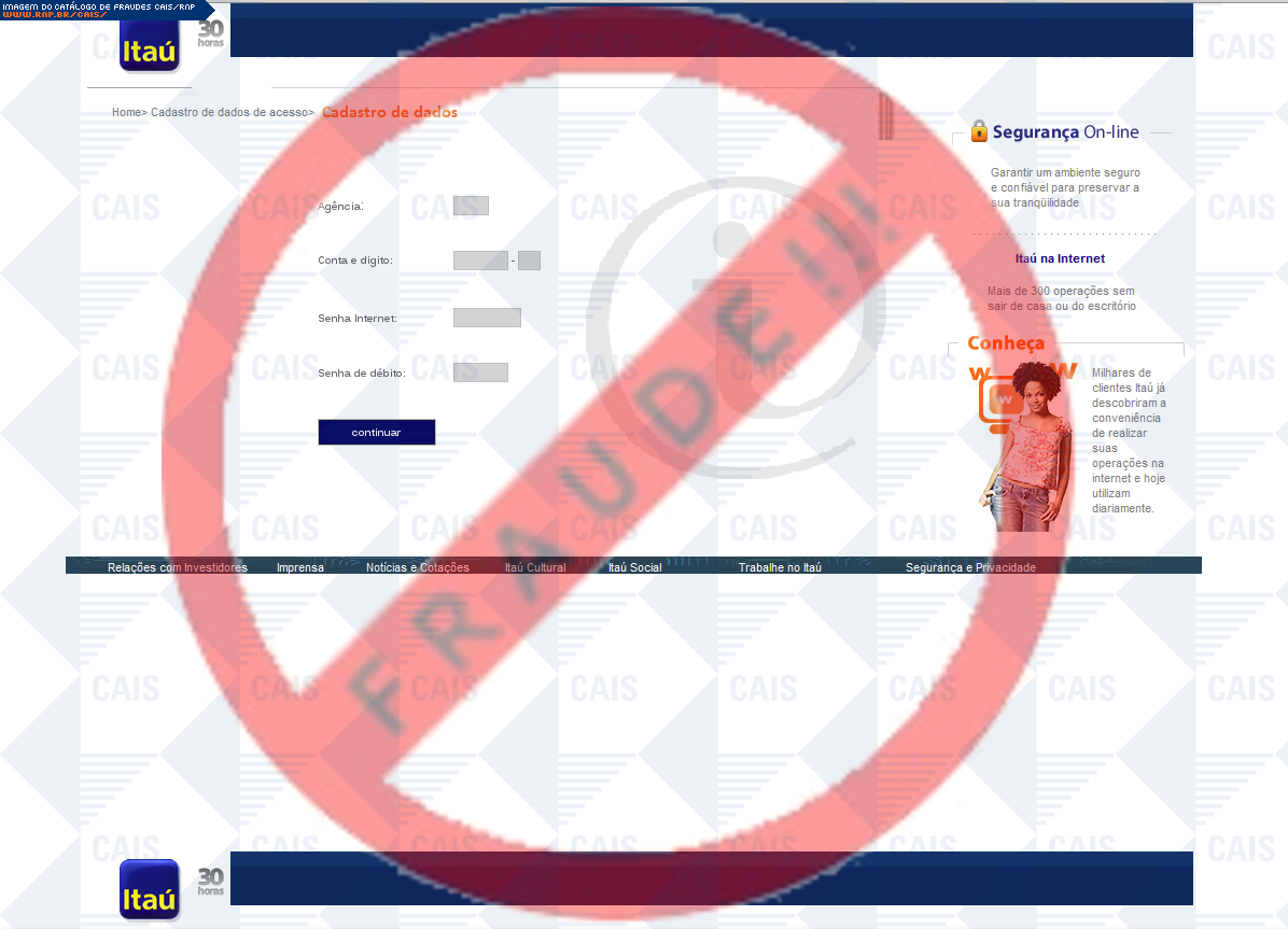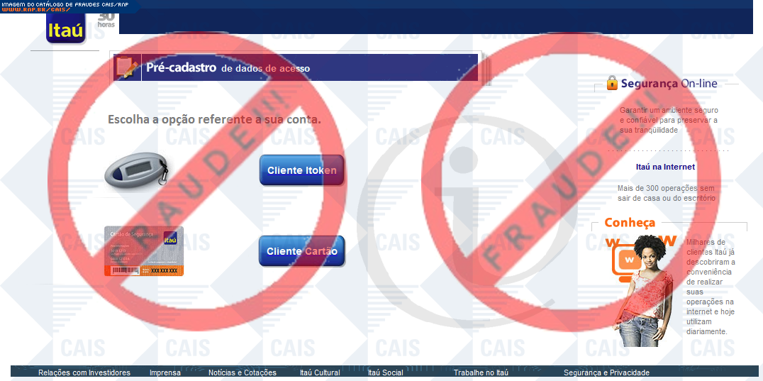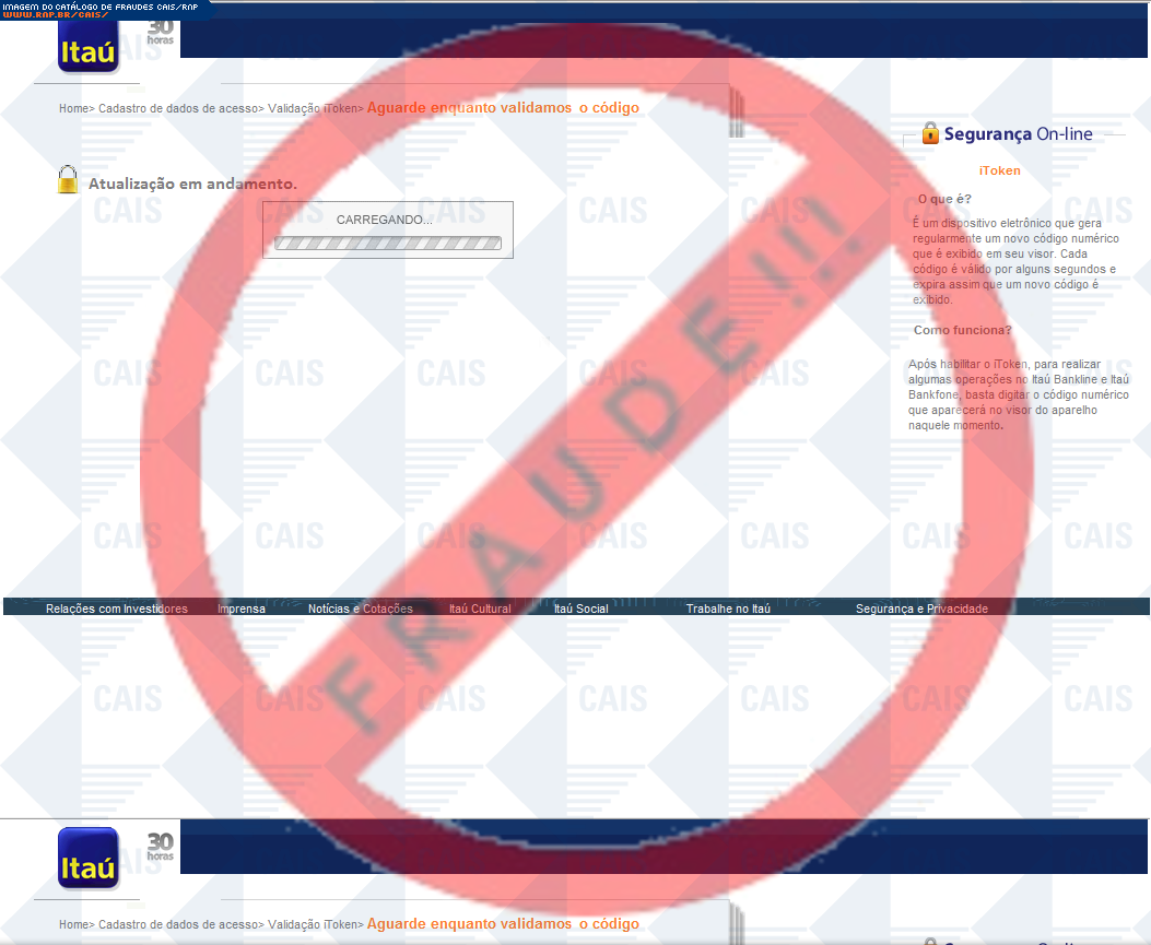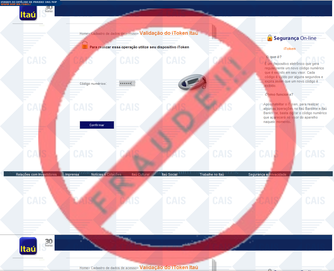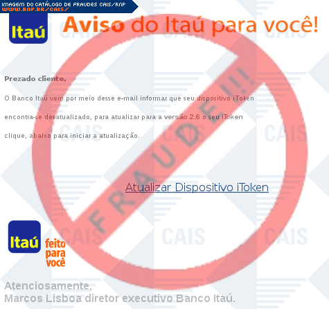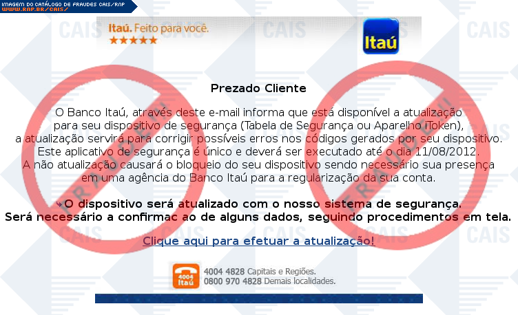 | comentário | A fraude se passa em nome do Banco Itaú, notificando o cliente que seu iToken encontra-se desatualizado. No email fraudulento há um link para a suposta atualização, que direciona o usuário para uma pagina falsa do banco, onde é solicitado diversas informações... (leia mais) | |