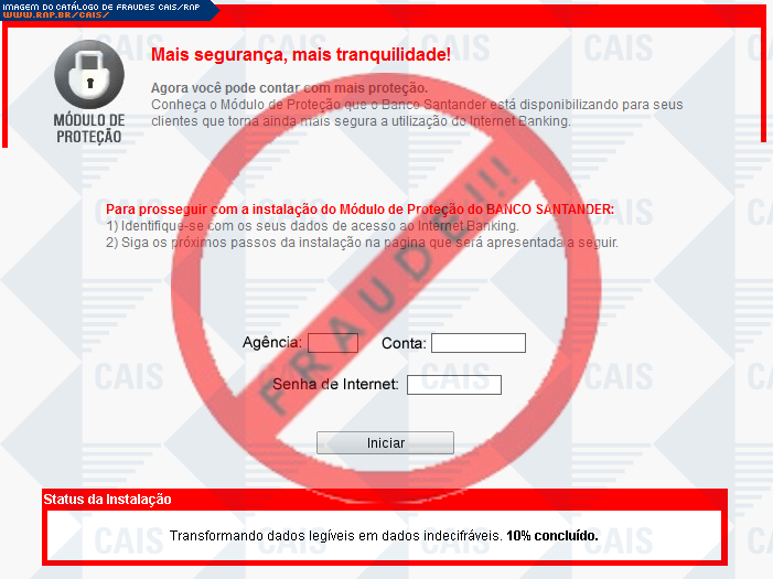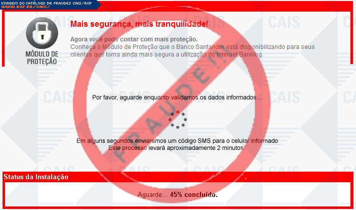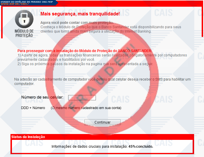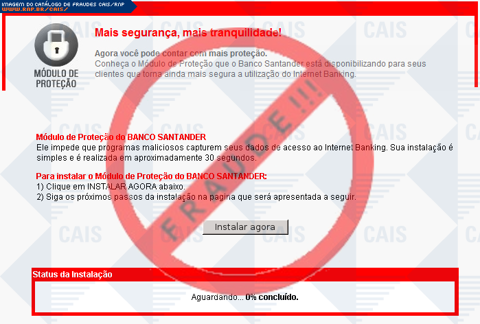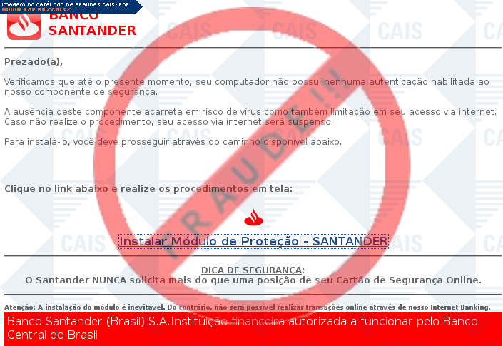| comentário | A fraude se passa em nome do banco Santander, informando ao usuário que o computador dele não possui os requisitos de segurança estabelecidos pelo banco. Nessa, ela informa que a não execução do módulo de segurança do banco pode acarretar em suspensão de... (leia mais) | |