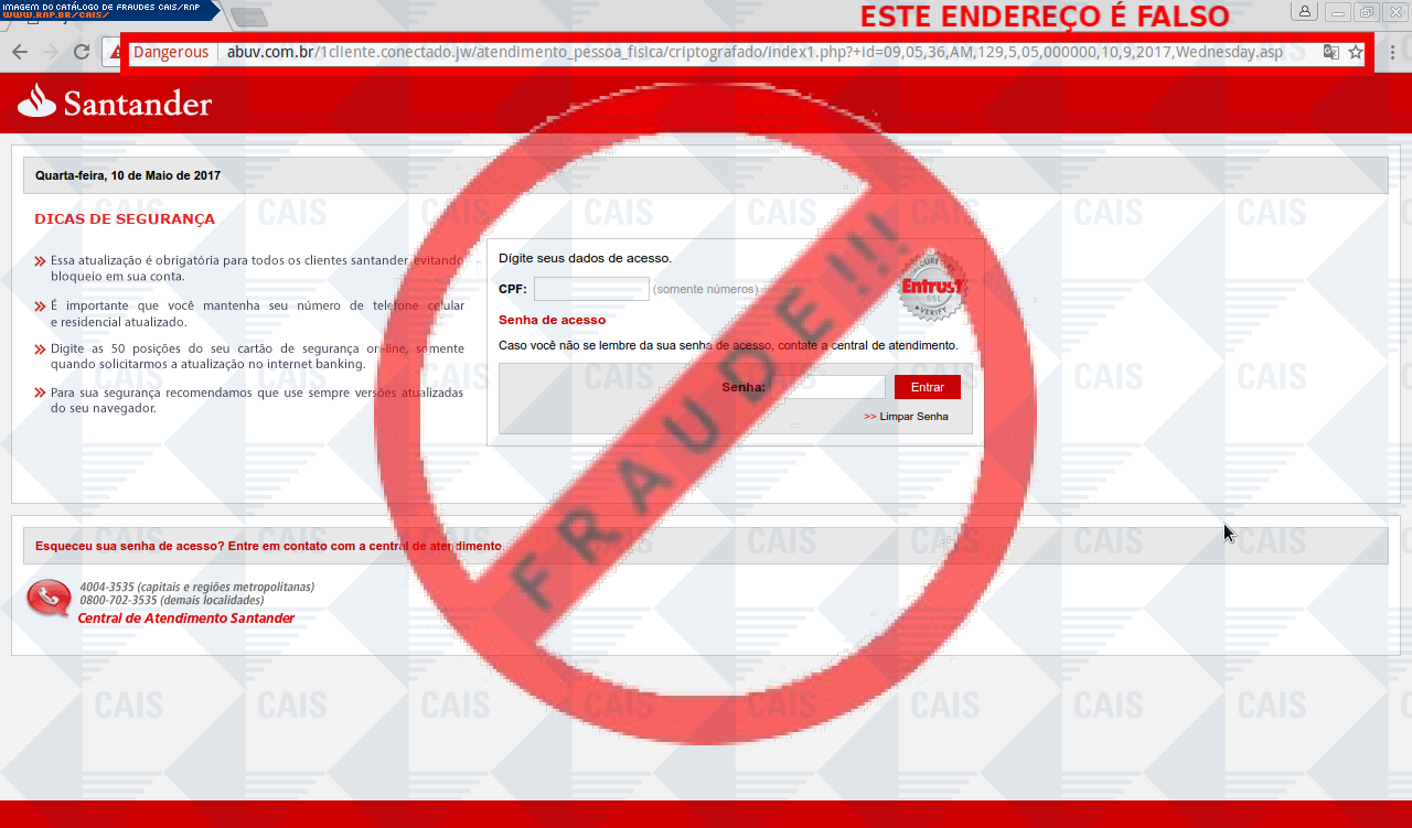 Esta página tem função informativa e educativa. Exibe uma coleção de imagens de phishing scam (fraudes eletrônicas) ou malware (código malicioso) veiculados por meio de spam (e-mail não-solicitado). Trata-se de conteúdo exemplificativo, não exaustivo, uma vez que não é possível contemplar todos os casos de fraudes existentes. Assim, caso você tenha conhecimento de um exemplar que não esteja aqui presente, isto não significa que não seja válido ou real. Inclusive incentivamos que você o envie para análise do CAIS para que, se for o caso, passe a integrar o nosso acervo.