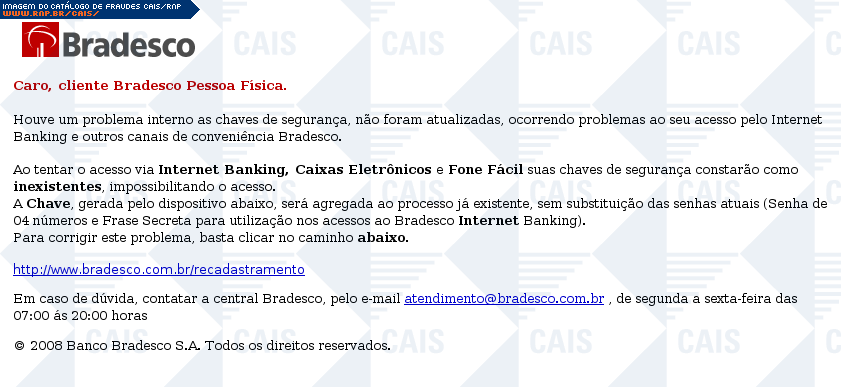 | comentário | Mensagem que se tenta se passar por um comunicado do banco Bradesco a respeito de supostas "chaves de segurança". A linguagem da mensagem é bem vaga sobre o significado das supostas chaves, o que deixa o usuário naturalmente preocupado. A mensagem tem o mesmo... (leia mais) | |
