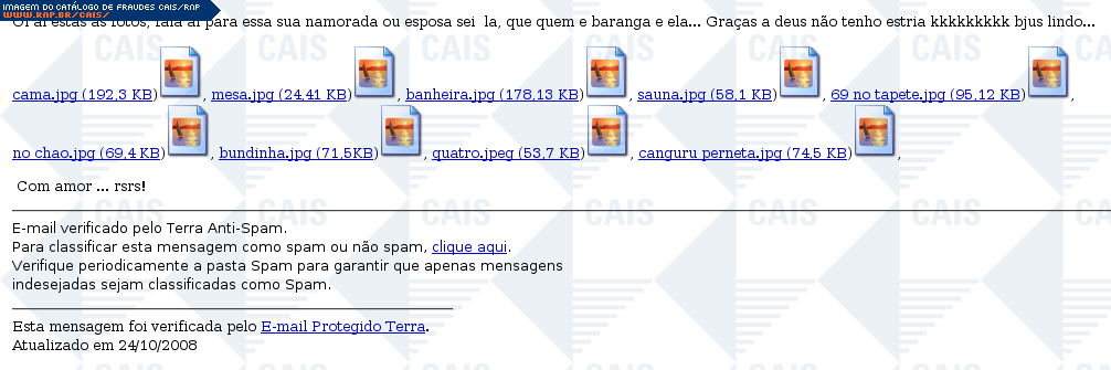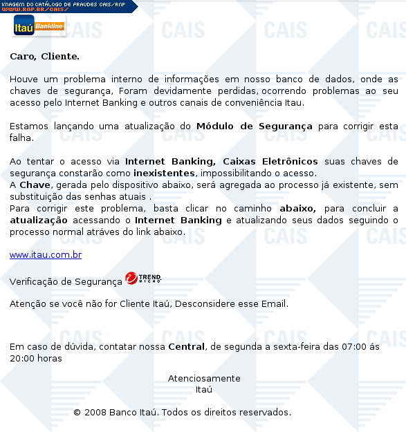 Esta página tem função informativa e educativa. Exibe uma coleção de imagens de phishing scam (fraudes eletrônicas) ou malware (código malicioso) veiculados por meio de spam (e-mail não-solicitado). Trata-se de conteúdo exemplificativo, não exaustivo, uma vez que não é possível contemplar todos os casos de fraudes existentes. Assim, caso você tenha conhecimento de um exemplar que não esteja aqui presente, isto não significa que não seja válido ou real. Inclusive incentivamos que você o envie para análise do CAIS para que, se for o caso, passe a integrar o nosso acervo.