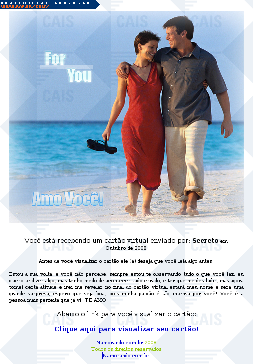 | comentário | Mensagem genérica de cartão de amor. A mensagem se passa por uma mensagem do serviço Namorando.com.br, pouco conhecido. OBS. (1) o software malicioso da amostra não estava mais disponível no momento da análise. | |