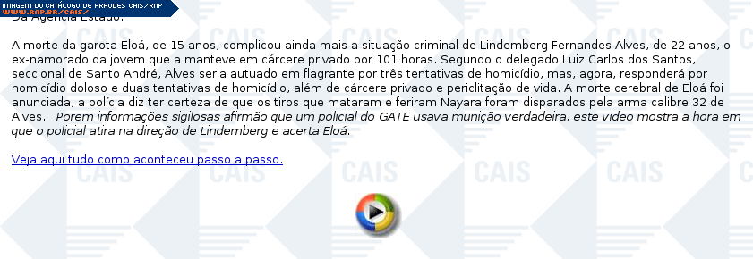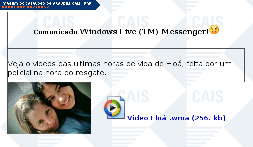| comentário | Notícias e vídeo falsos sobre o caso da garota Eloá, mantida como refém por Lindemberg Fernandes Alves. O software malicioso foi identificado como "Downloader" (Symantec). | |