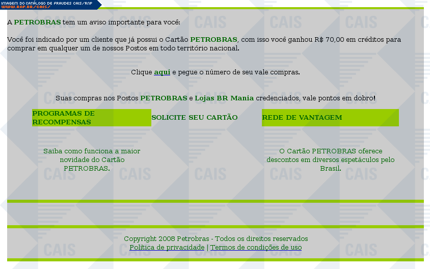| comentário | Mensagem que se passa por um comunicado da Petrobrás, informando sobre um suposto crédito de R$70,00 que pode ser utilizado em postos da rede. Trata-se de um assunto bem oportuno, prêmios na forma de combustível são bem populares e atraentes. OBS. (1) o software... (leia mais) | |