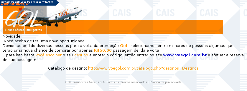 | comentário | Mensagem que se passa por um comunicado da Gol Linhas Aéreas informando sobre uma promoção com preços bem atraentes. OBS. (1) o software malicioso da amostra não estava mais disponível no momento da análise. | |