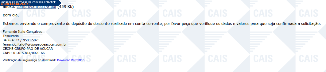 | comentário | A mensagem se passa pelo envio de um comprovante de depósito que teria sido realizado pelo grupo Pão de Açúcar. O conteúdo malicioso não estava mais disponível no momento da análise. | |