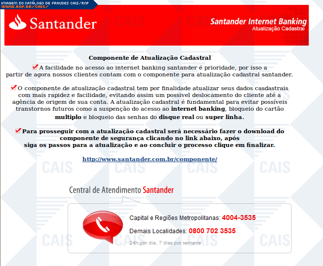 | comentário | A fraude usa o nome do banco Santander para informar que a vítima deve realizar uma falsa atualização cadastral. A mensagem contém um link que leva a um software malicioso que foi identificado como Trojan-Banker.Win32.Bancos.sux (Kaspersky). | |
