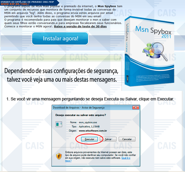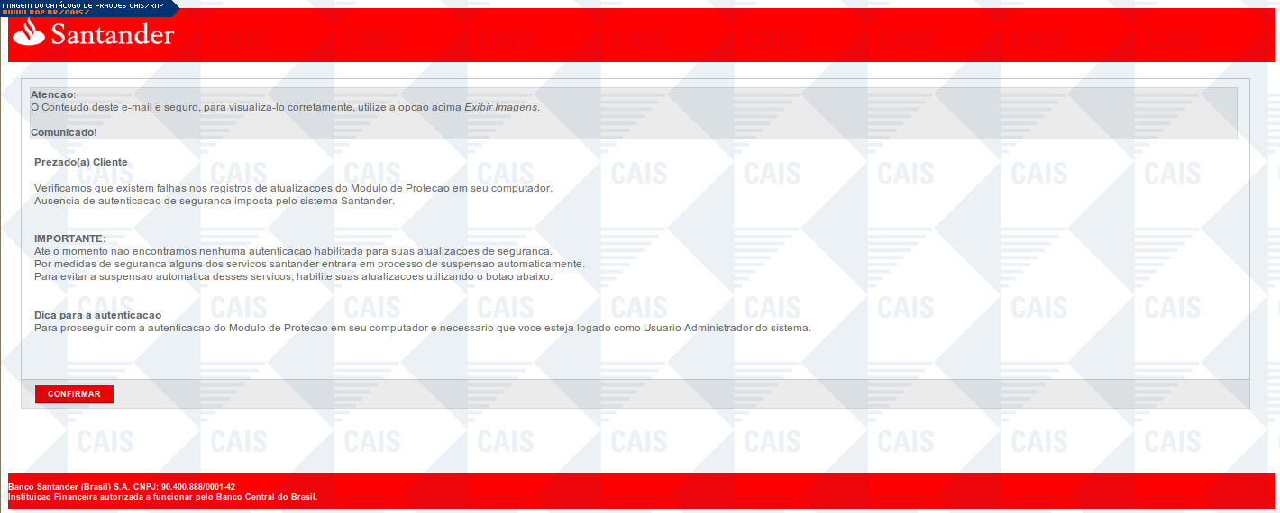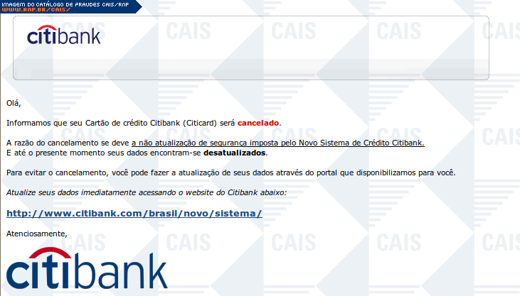 Esta página tem função informativa e educativa. Exibe uma coleção de imagens de phishing scam (fraudes eletrônicas) ou malware (código malicioso) veiculados por meio de spam (e-mail não-solicitado). Trata-se de conteúdo exemplificativo, não exaustivo, uma vez que não é possível contemplar todos os casos de fraudes existentes. Assim, caso você tenha conhecimento de um exemplar que não esteja aqui presente, isto não significa que não seja válido ou real. Inclusive incentivamos que você o envie para análise do CAIS para que, se for o caso, passe a integrar o nosso acervo.