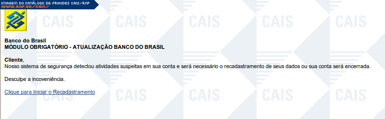 | comentário | A fraude usa o nome do Banco do Brasil para tentar aliciar a vítima a realizar um recadastramento falso. O link para o recadastramento leva a uma página falsa, destinada a roubar dados da conta bancária da vítima. | |