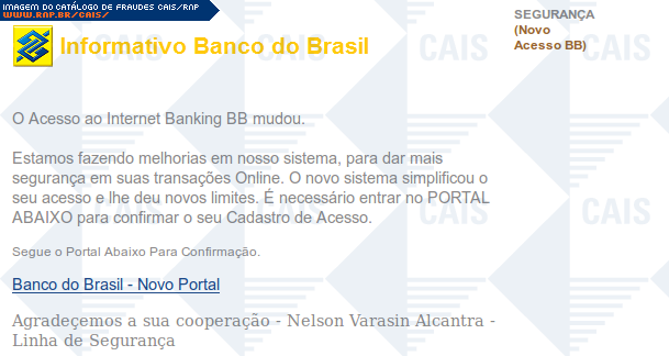 | comentário | A fraude contém um link para que a vítima se cadastre no novo portal do Banco do Brasil. O link leva a um site falso, destinado a coletar dados da conta bancária da vítima. | |