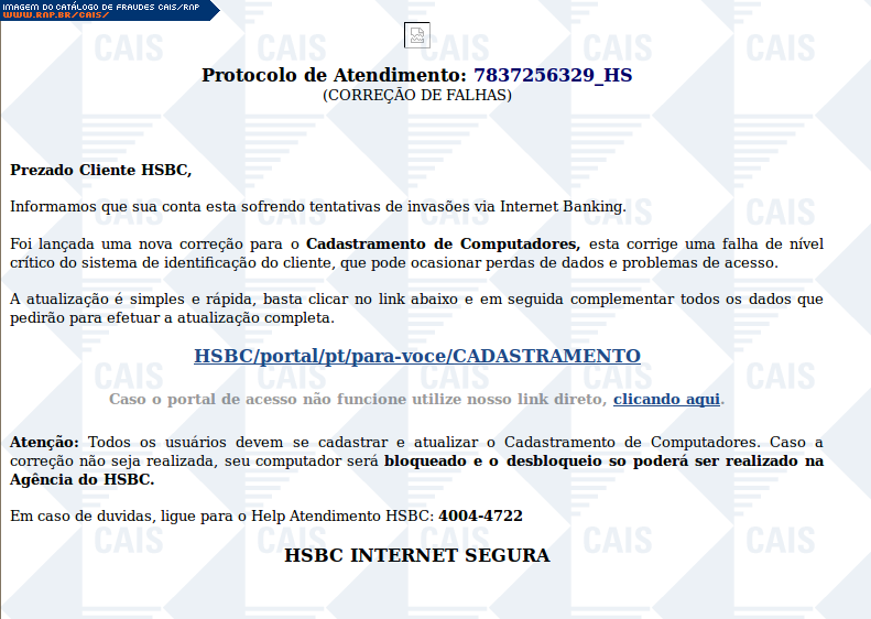 | comentário | O comunicado falso, em nome do banco HSBC, alerta que a vítima deve realizar uma correção para o cadastramento de computadores. O link para o suposto cadastro leva a uma página falsa que não estava mais disponível no momento da análise. | |