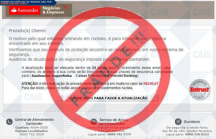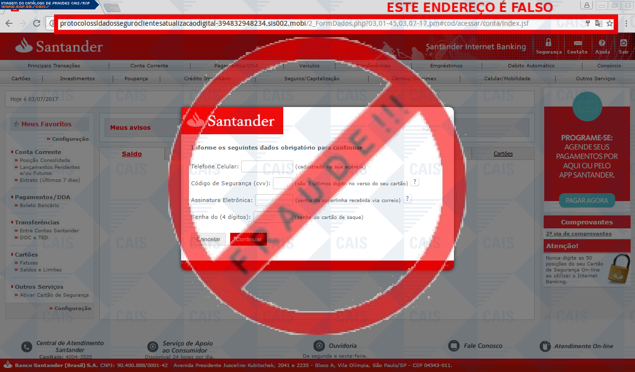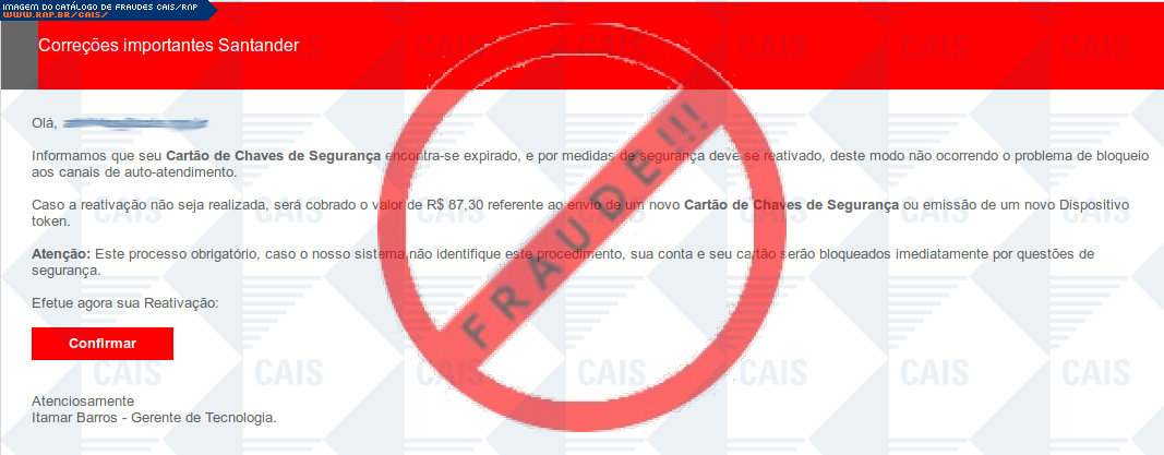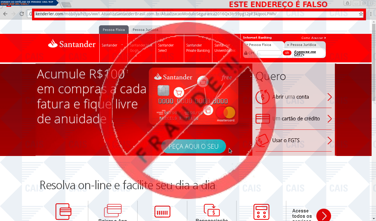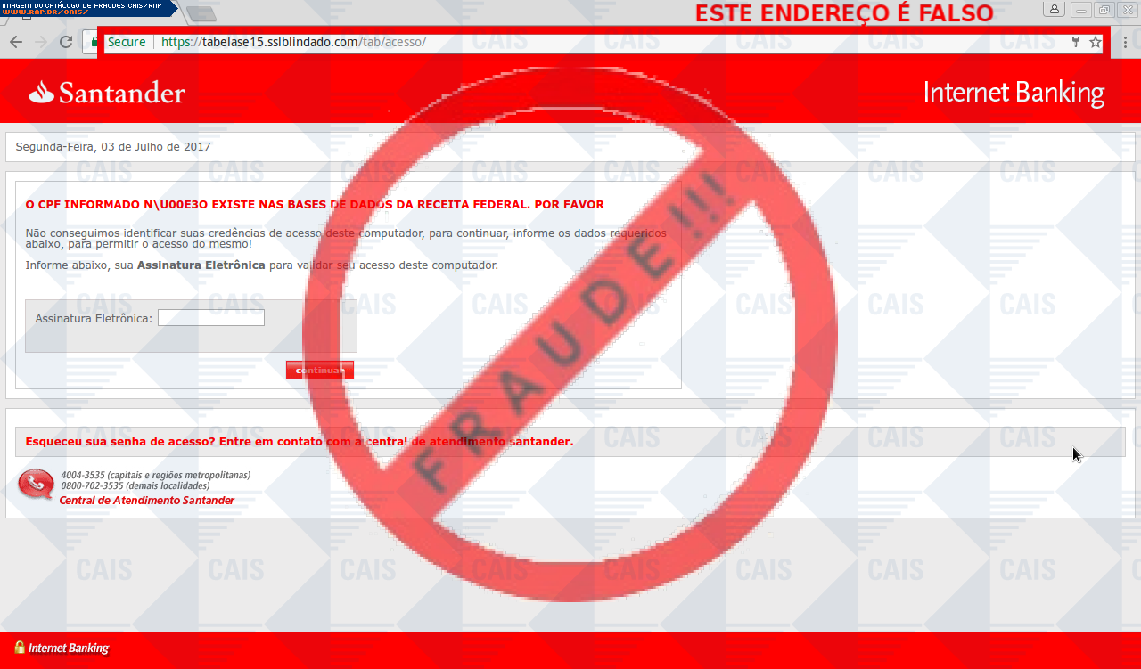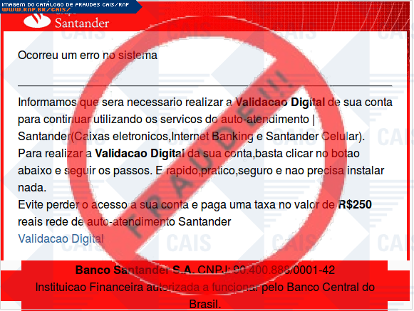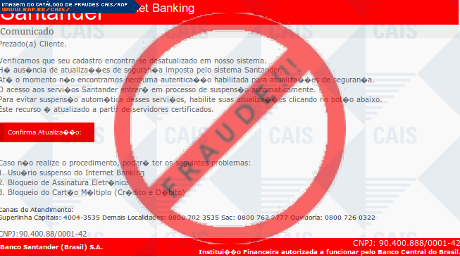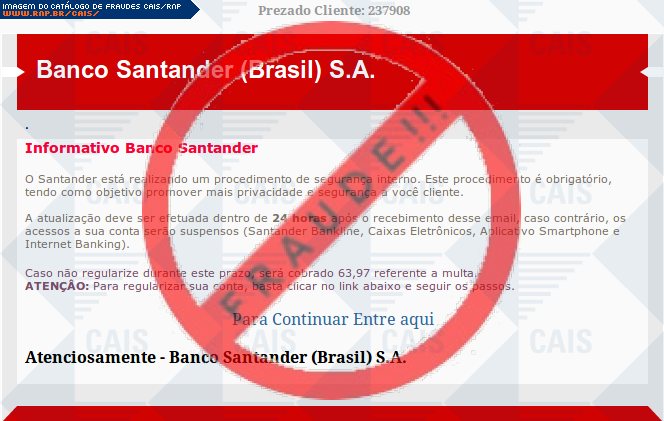 Esta página tem função informativa e educativa. Exibe uma coleção de imagens de phishing scam (fraudes eletrônicas) ou malware (código malicioso) veiculados por meio de spam (e-mail não-solicitado). Trata-se de conteúdo exemplificativo, não exaustivo, uma vez que não é possível contemplar todos os casos de fraudes existentes. Assim, caso você tenha conhecimento de um exemplar que não esteja aqui presente, isto não significa que não seja válido ou real. Inclusive incentivamos que você o envie para análise do CAIS para que, se for o caso, passe a integrar o nosso acervo.