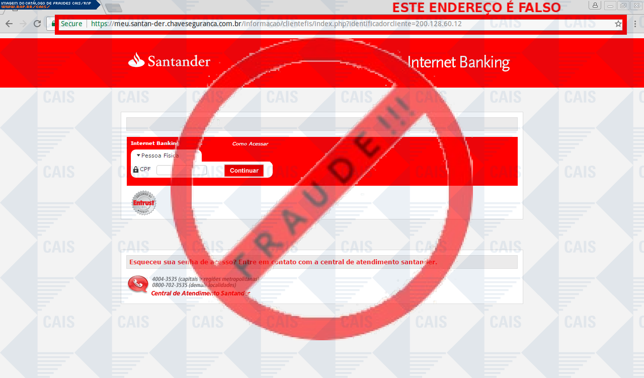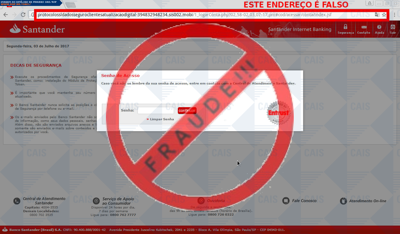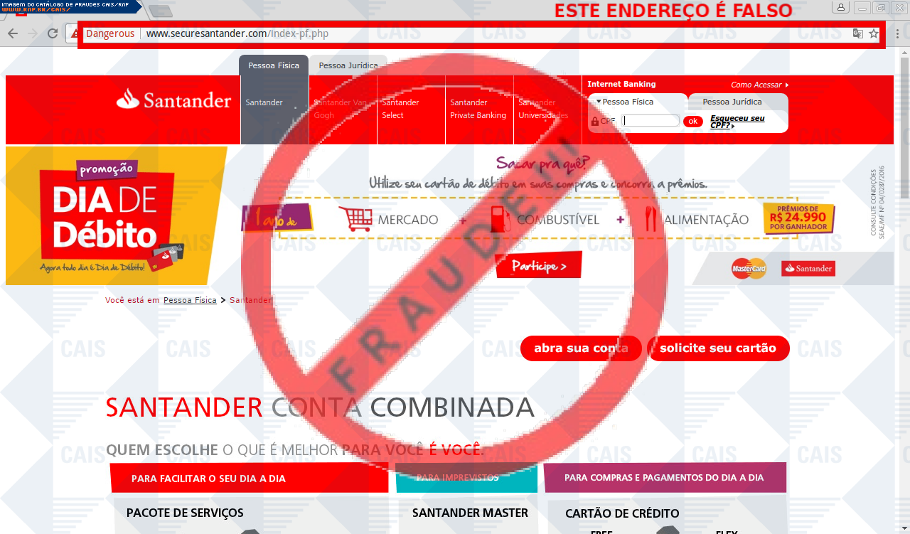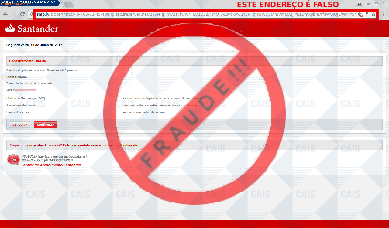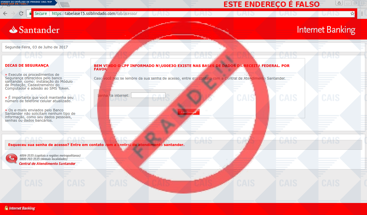 Esta página tem função informativa e educativa. Exibe uma coleção de imagens de phishing scam (fraudes eletrônicas) ou malware (código malicioso) veiculados por meio de spam (e-mail não-solicitado). Trata-se de conteúdo exemplificativo, não exaustivo, uma vez que não é possível contemplar todos os casos de fraudes existentes. Assim, caso você tenha conhecimento de um exemplar que não esteja aqui presente, isto não significa que não seja válido ou real. Inclusive incentivamos que você o envie para análise do CAIS para que, se for o caso, passe a integrar o nosso acervo.