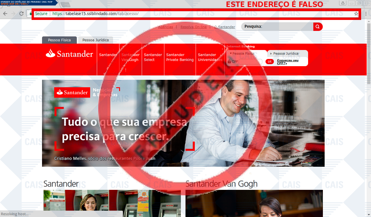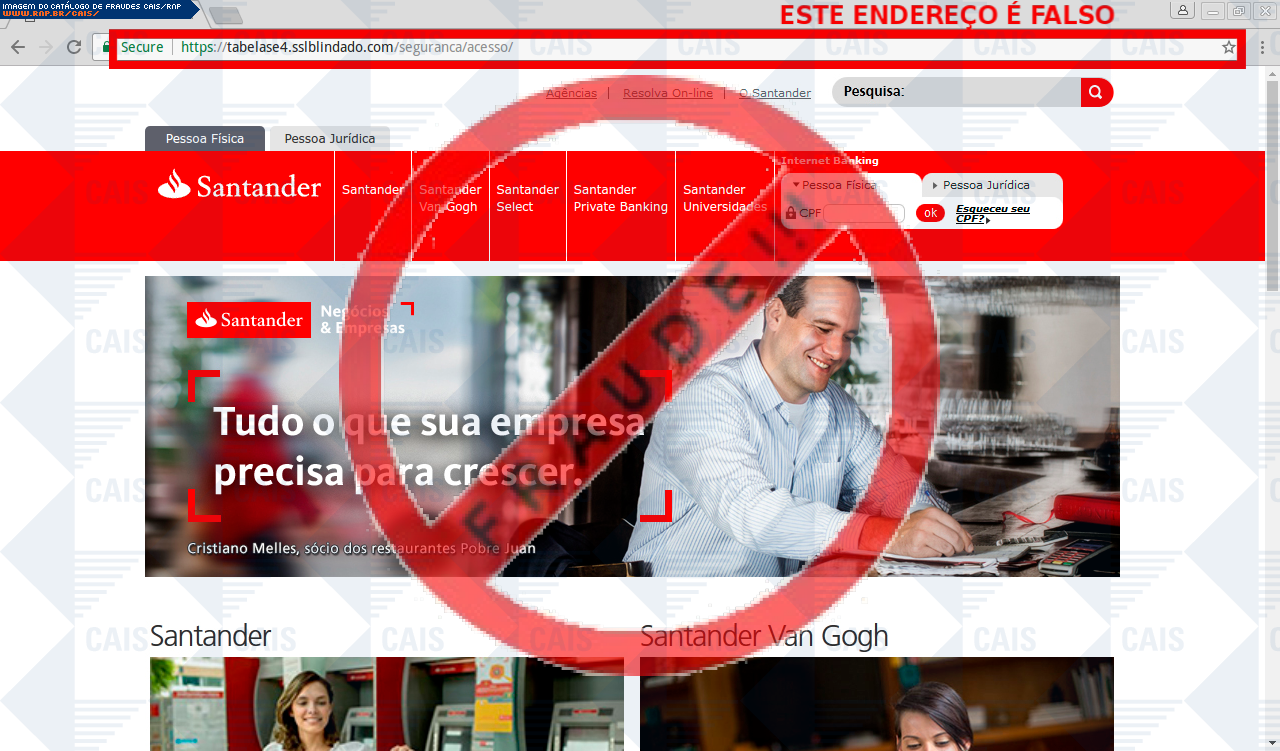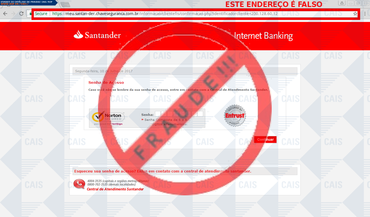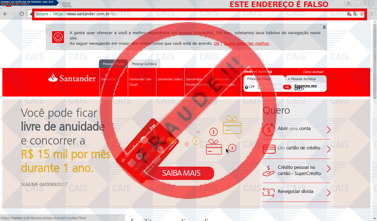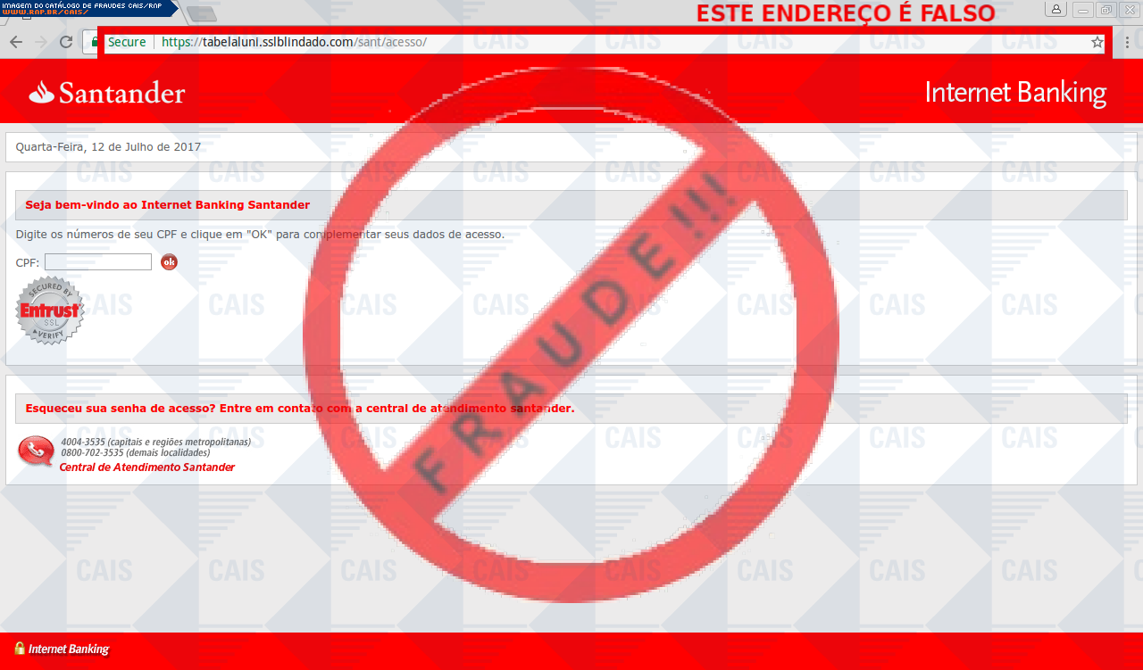 Esta página tem função informativa e educativa. Exibe uma coleção de imagens de phishing scam (fraudes eletrônicas) ou malware (código malicioso) veiculados por meio de spam (e-mail não-solicitado). Trata-se de conteúdo exemplificativo, não exaustivo, uma vez que não é possível contemplar todos os casos de fraudes existentes. Assim, caso você tenha conhecimento de um exemplar que não esteja aqui presente, isto não significa que não seja válido ou real. Inclusive incentivamos que você o envie para análise do CAIS para que, se for o caso, passe a integrar o nosso acervo.