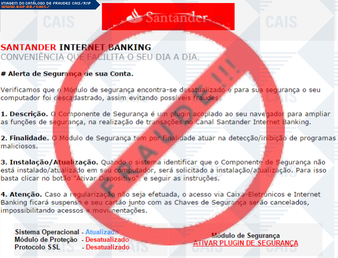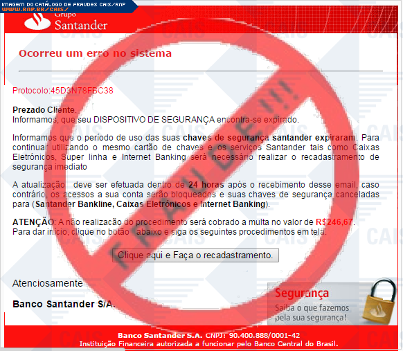| comentário | O usuário recebe um e-mail informando que o dispositivo de segurança da conta Santander encontra-se desabilitado, sendo necessário realizar um recadastramento no link disponibilizado, entretanto a página fornecida é falsa criada para roubar os dados bancários... (leia mais) | |