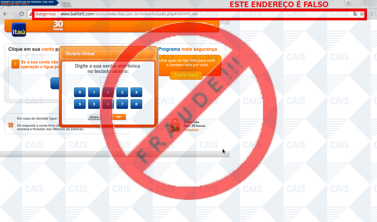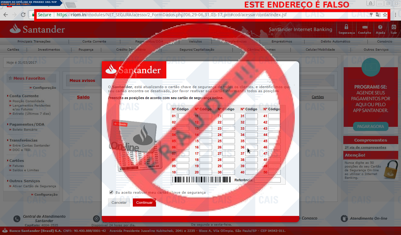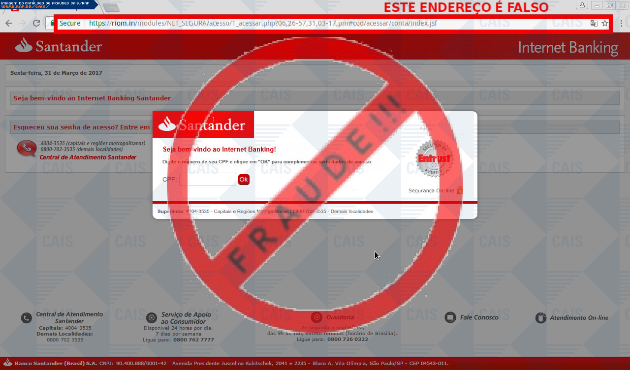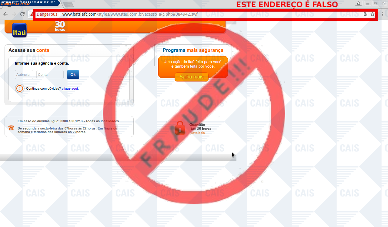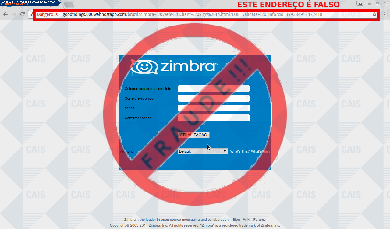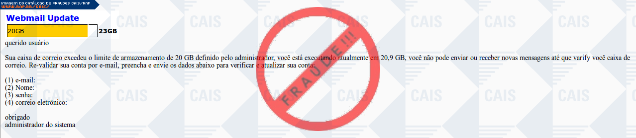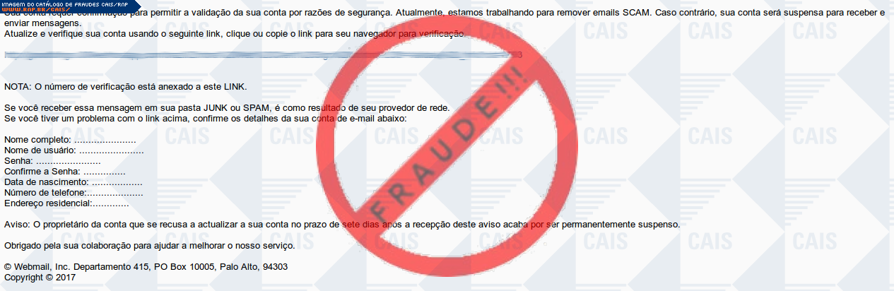 Esta página tem função informativa e educativa. Exibe uma coleção de imagens de phishing scam (fraudes eletrônicas) ou malware (código malicioso) veiculados por meio de spam (e-mail não-solicitado). Trata-se de conteúdo exemplificativo, não exaustivo, uma vez que não é possível contemplar todos os casos de fraudes existentes. Assim, caso você tenha conhecimento de um exemplar que não esteja aqui presente, isto não significa que não seja válido ou real. Inclusive incentivamos que você o envie para análise do CAIS para que, se for o caso, passe a integrar o nosso acervo.