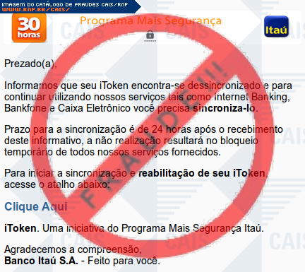 | comentário | A vítima recebe uma mensagem informando que seu cartão itoken referente a uma conta no banco Itaú não está sincronizado sendo necessário realizar a sincronização no link disponível, entretanto a página é falsa criada para roubar os dados bancários do usuário.... (leia mais) | |