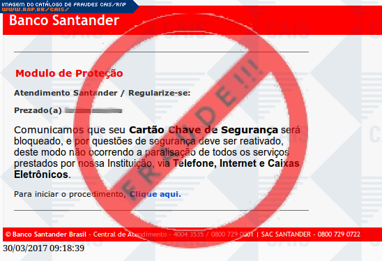 | comentário | O usuário recebe um e-mail informando que sua chave de segurança da conta no Santander expirou sendo necessário realizar uma atualização no link disponibilizado, entretanto a página fornecida é falsa criada para roubar os dados bancários da vítima. | |