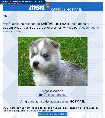 | comentário | Fraude do tipo "cartão virtual" que utiliza o nome do site Hotmail. O link atrelado na mensagem faz o download do arquivo malicioso 2603.exe. | |