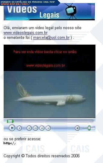 | comentário | Fraude do tipo "vídeo" que informa sobre um vídeo legal. A mensagem fraudulenta tem uma foto de um avião da GOL e o link atrelado faz o download do arquivo web.exe que possui 2.8MB e foi identificado por antivirus como Trojan-Spy.Win32.Banker.hsp | |
