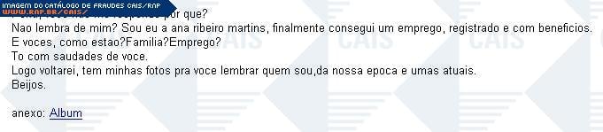 | comentário | Fraude que se passa por mensagem de Ana Ribeiro Martins (?) e fornece um album de fotos para relembrar da Ana. O link disponível na mensagem faz o download do arquivo album.scr que foi identificado por antivirus como Trojan-Downloader:W32/Banload.FMJ | |