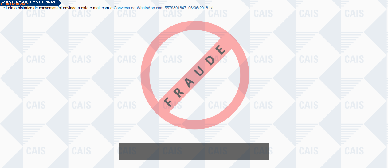 Esta página tem função informativa e educativa. Exibe uma coleção de imagens de phishing scam (fraudes eletrônicas) ou malware (código malicioso) veiculados por meio de spam (e-mail não-solicitado). Trata-se de conteúdo exemplificativo, não exaustivo, uma vez que não é possível contemplar todos os casos de fraudes existentes. Assim, caso você tenha conhecimento de um exemplar que não esteja aqui presente, isto não significa que não seja válido ou real. Inclusive incentivamos que você o envie para análise do CAIS para que, se for o caso, passe a integrar o nosso acervo.