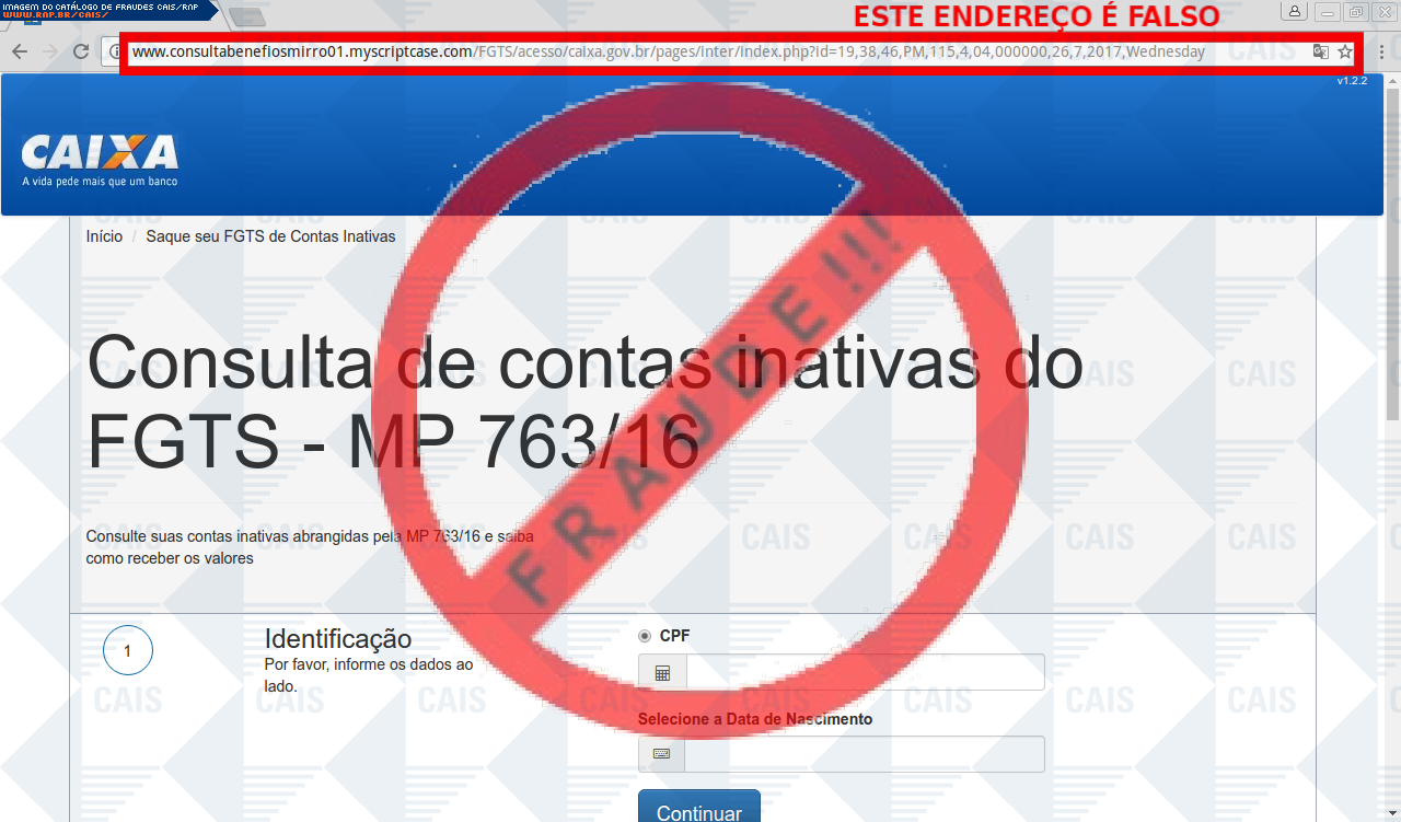 Esta página tem função informativa e educativa. Exibe uma coleção de imagens de phishing scam (fraudes eletrônicas) ou malware (código malicioso) veiculados por meio de spam (e-mail não-solicitado). Trata-se de conteúdo exemplificativo, não exaustivo, uma vez que não é possível contemplar todos os casos de fraudes existentes. Assim, caso você tenha conhecimento de um exemplar que não esteja aqui presente, isto não significa que não seja válido ou real. Inclusive incentivamos que você o envie para análise do CAIS para que, se for o caso, passe a integrar o nosso acervo.