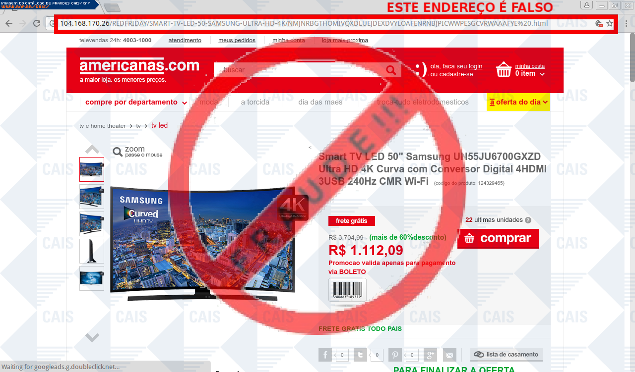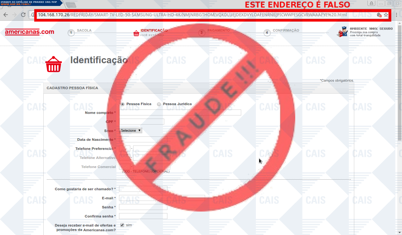A vítima recebe um e-mail informando sobre promoções no site de compra da Americans disponibilizando link de vários produtos em desconto, no entanto a página é falsa destinada a roubar as informações pessoais e do cartão de crédito/débito do usuário.