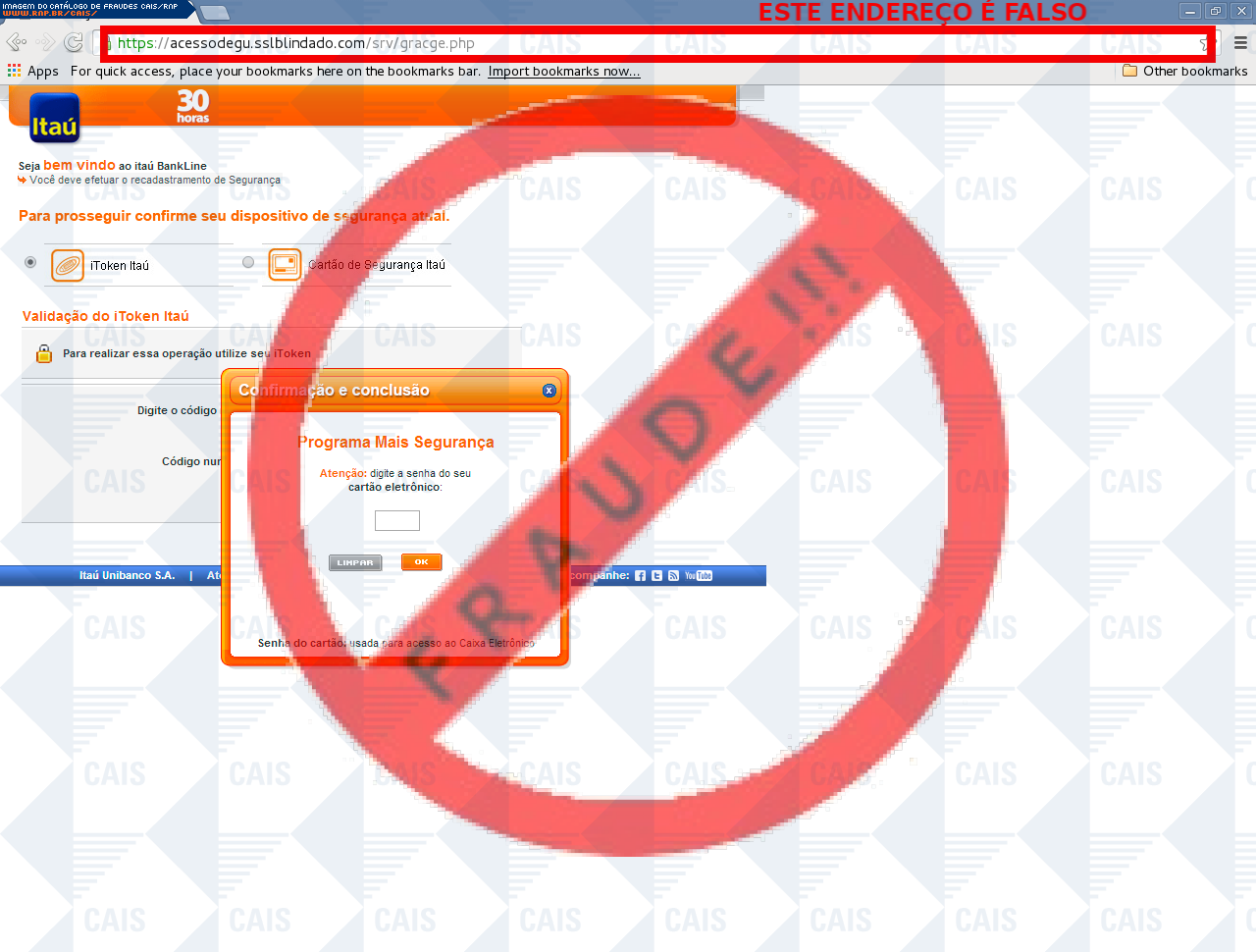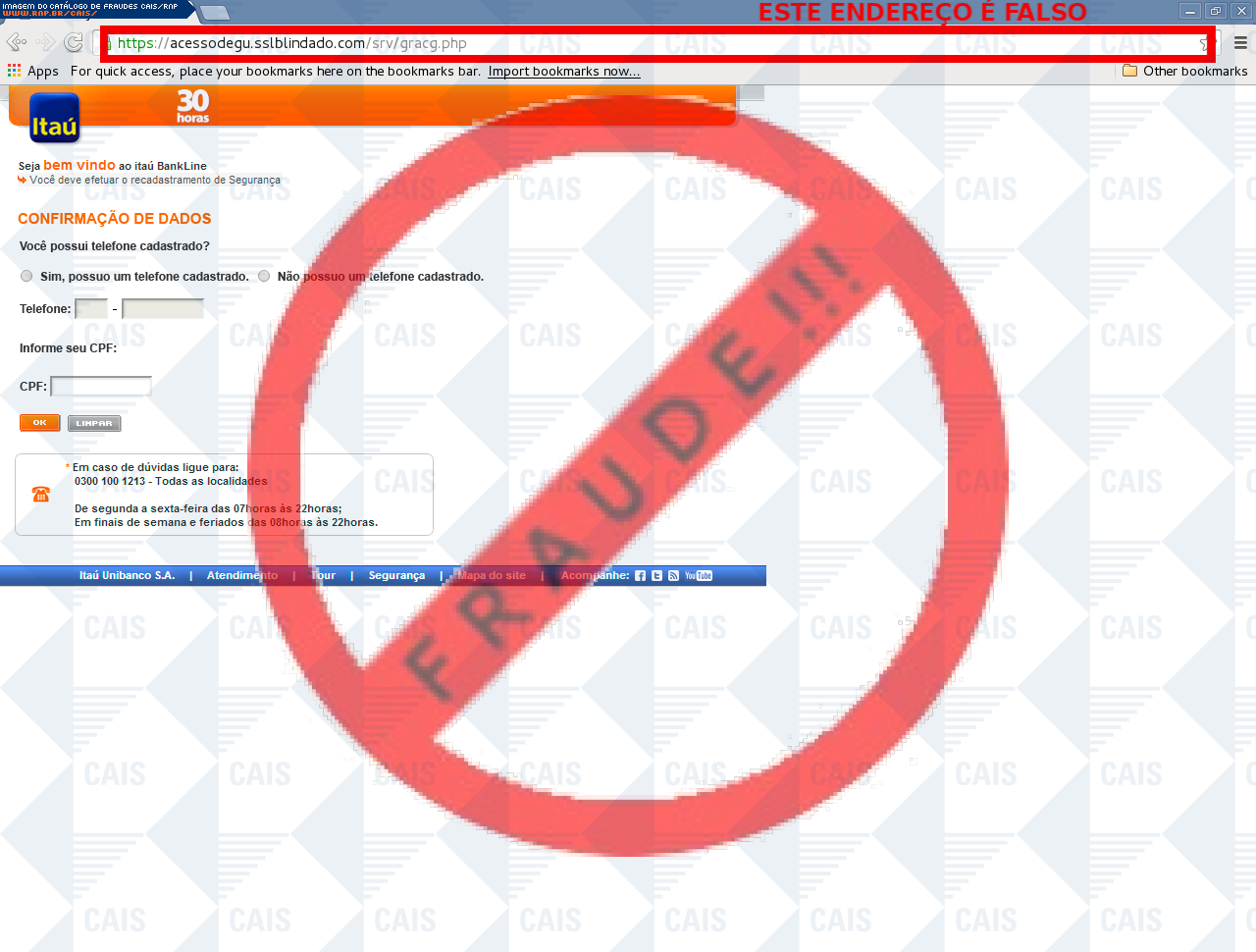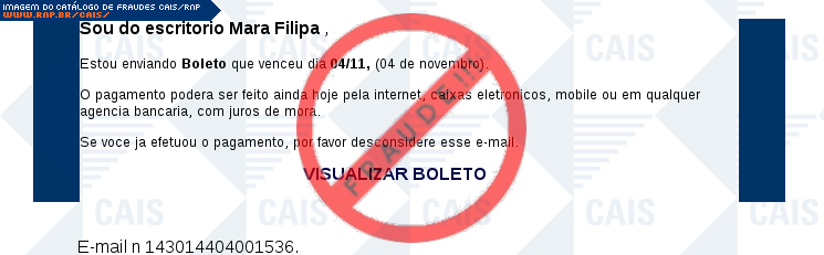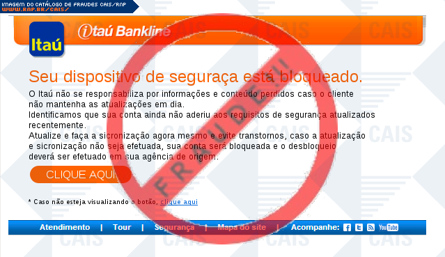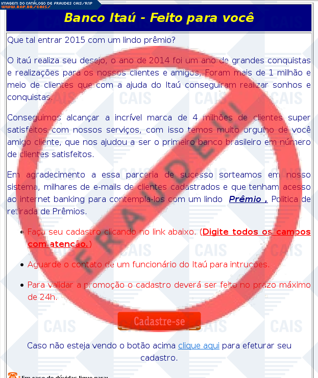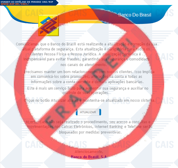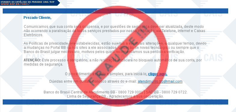Esta página tem função informativa e educativa. Exibe uma coleção de imagens de phishing scam (fraudes eletrônicas) ou malware (código malicioso) veiculados por meio de spam (e-mail não-solicitado). Trata-se de conteúdo exemplificativo, não exaustivo, uma vez que não é possível contemplar todos os casos de fraudes existentes. Assim, caso você tenha conhecimento de um exemplar que não esteja aqui presente, isto não significa que não seja válido ou real. Inclusive incentivamos que você o envie para análise do CAIS para que, se for o caso, passe a integrar o nosso acervo.
