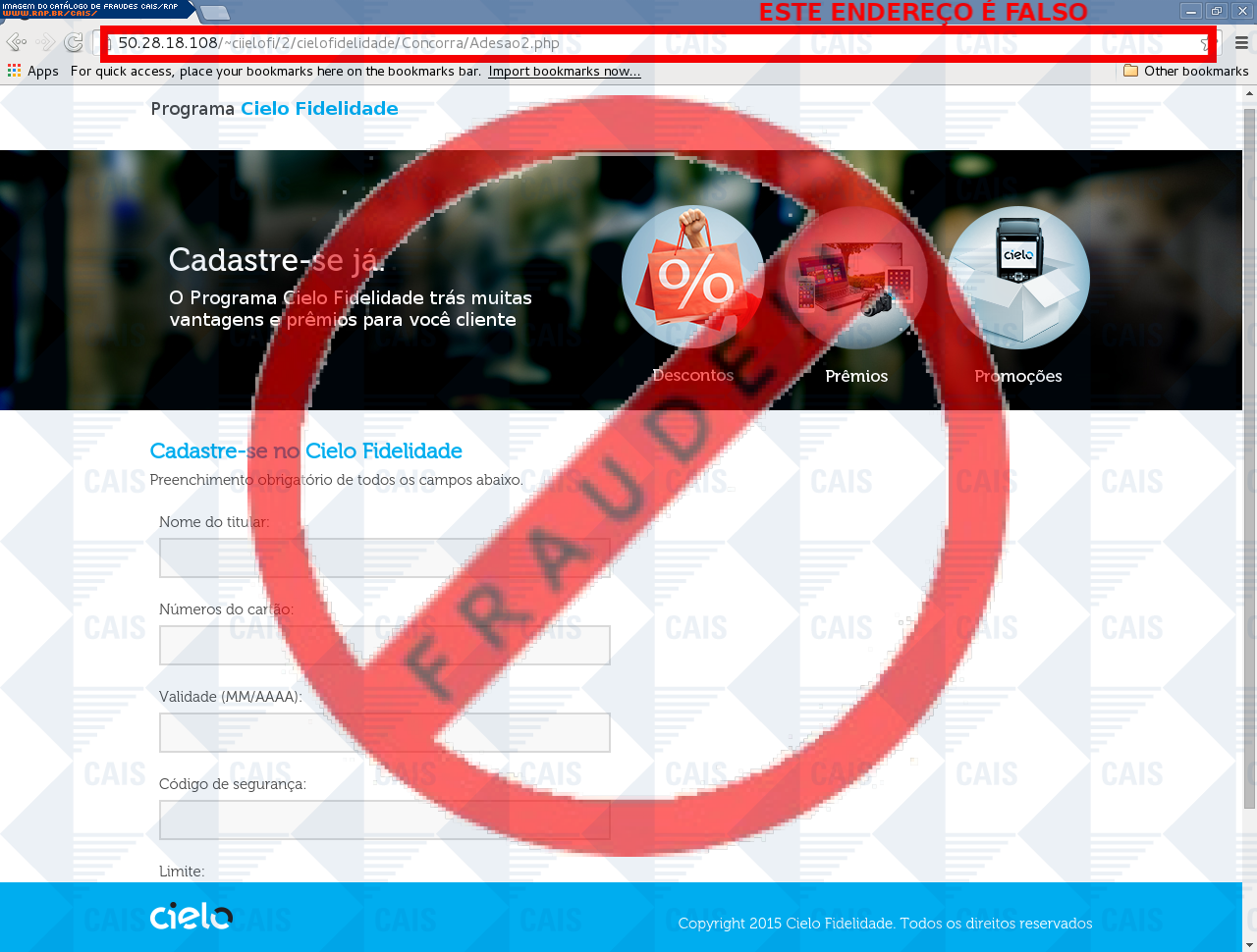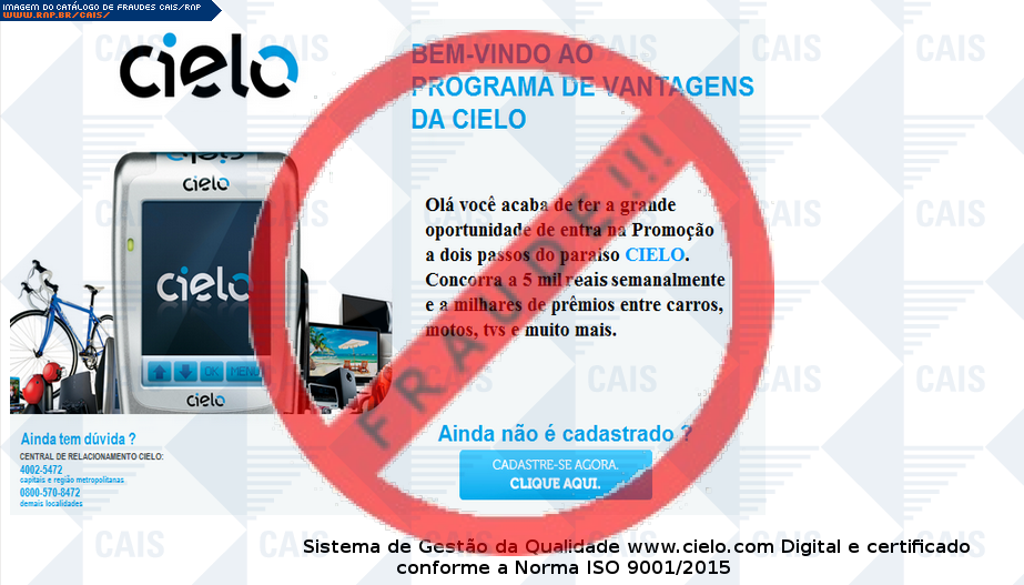 | comentário | A vítima recebe um e-mail informando sobre os benefícios do programa de vantagens do cartão Cielo disponibilizando o link para cadastro, no entanto a página é falsa criada para roubar as informações do cartão da vítima. | |