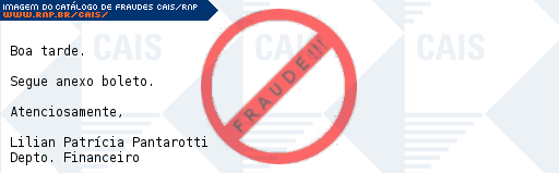 | comentário | O usuário recebe uma mensagem contendo um boleto disponível em anexo, no entanto o arquivo originado é malicioso criado para roubar informações da vítima e instalar outros arquivos fraudulentos com o nome de Downloader.Banload2.XDQ. | |
