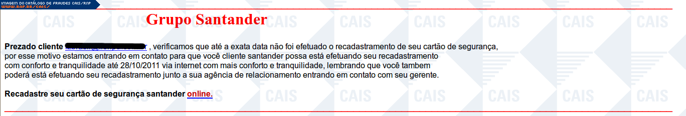 | comentário | A mensagem se passa por um comunicado do banco Santander, que informa que a vitima deve realizar o recadastramento do cartão de segurança. O link para o suposto recadastramento leva a conteúdo malicioso que já havia sido removido no momento da análise. | |