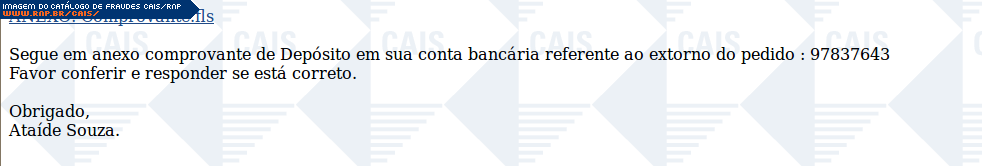| comentário | A fraude se passa por um compravante de depósito e contém um link que leva ao malware HEUR:Trojan-Downloader.Win32.Generic (Kaspersky). | |