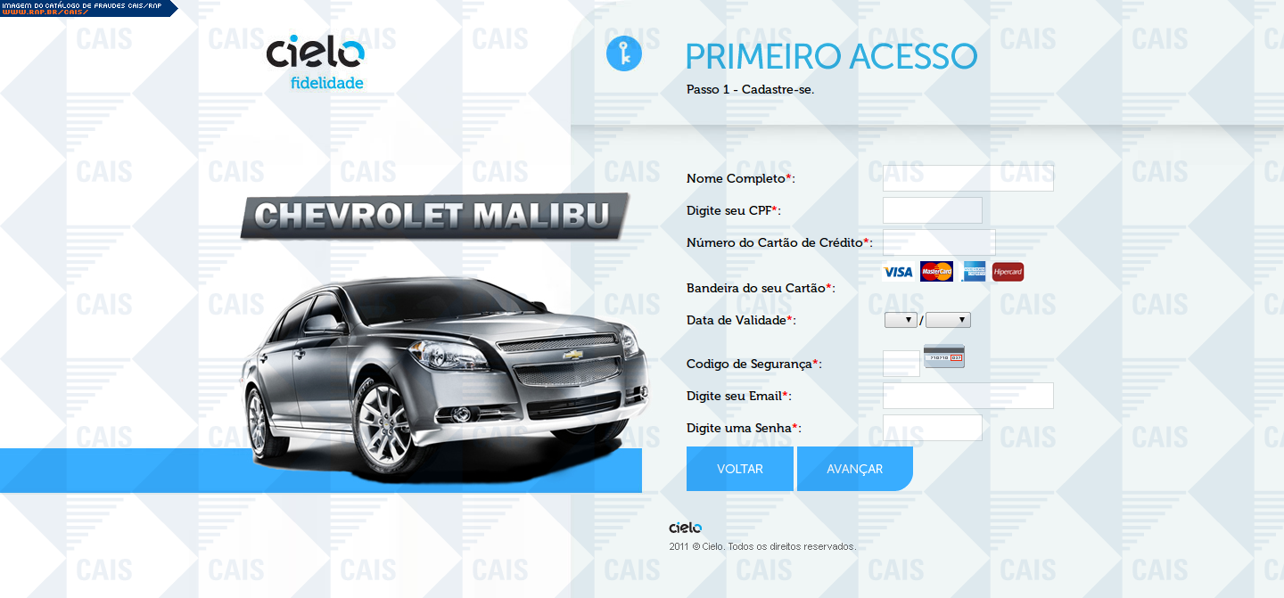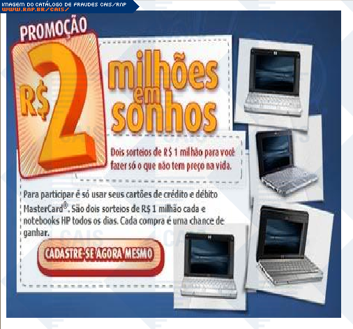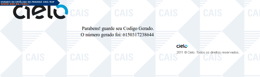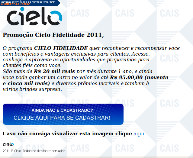 | comentário | A mensagem usa o nome da Cielo para anunciar uma promoção. O link para o cadastro na promoção leva a uma página falsa, destinada a coletar dados do cartão de crédito da vítima. Observação: o site falso só aceita números válidos de cartão de crédito. | |