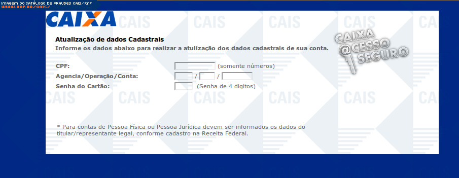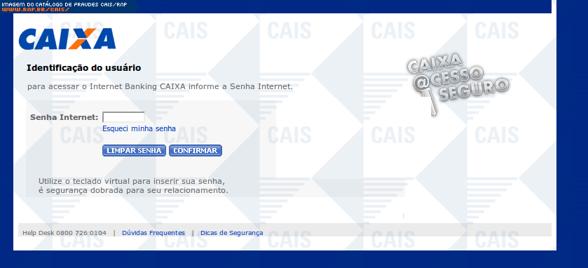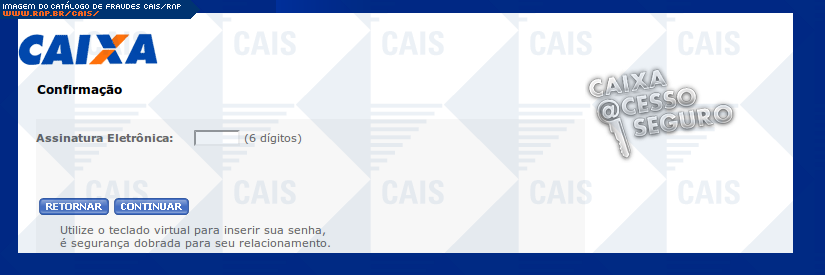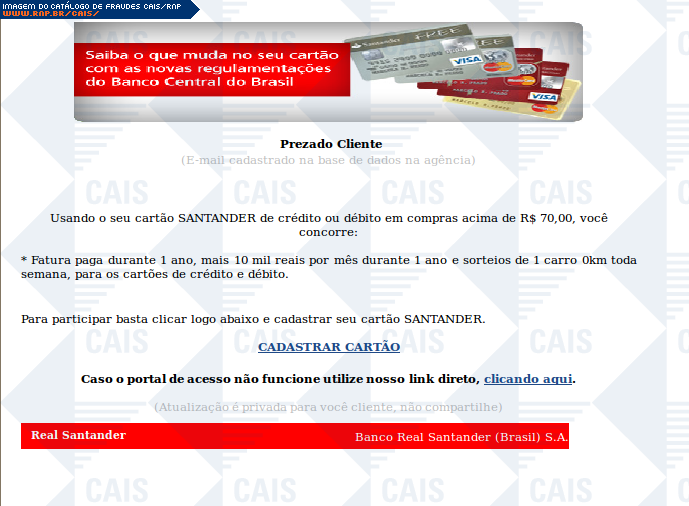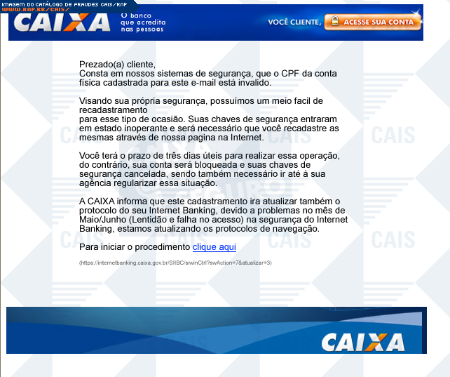 Esta página tem função informativa e educativa. Exibe uma coleção de imagens de phishing scam (fraudes eletrônicas) ou malware (código malicioso) veiculados por meio de spam (e-mail não-solicitado). Trata-se de conteúdo exemplificativo, não exaustivo, uma vez que não é possível contemplar todos os casos de fraudes existentes. Assim, caso você tenha conhecimento de um exemplar que não esteja aqui presente, isto não significa que não seja válido ou real. Inclusive incentivamos que você o envie para análise do CAIS para que, se for o caso, passe a integrar o nosso acervo.