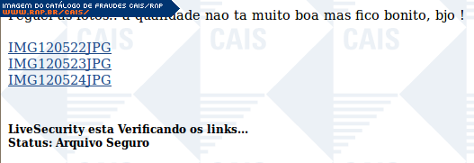 | comentário | A mensagem contém links para supostas fotos. Os links levam ao arquivo malicioso que foi identificado como Gen:Trojan.Crypt.Delf.F.GGW@a4NSXwkG (BitDefender). | |