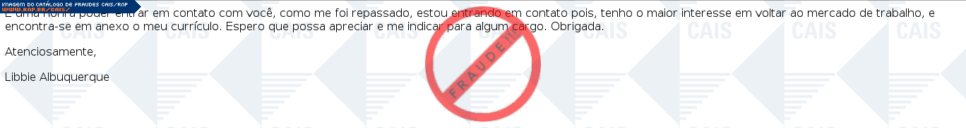 | comentário | O usuário recebe uma mensagem contendo um currículo em anexo, no entanto o arquivo originado é malicioso criado para roubar informações da vítima e instalar outros arquivos fraudulentos com o nome de VBS/Downloader. | |