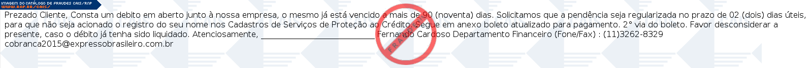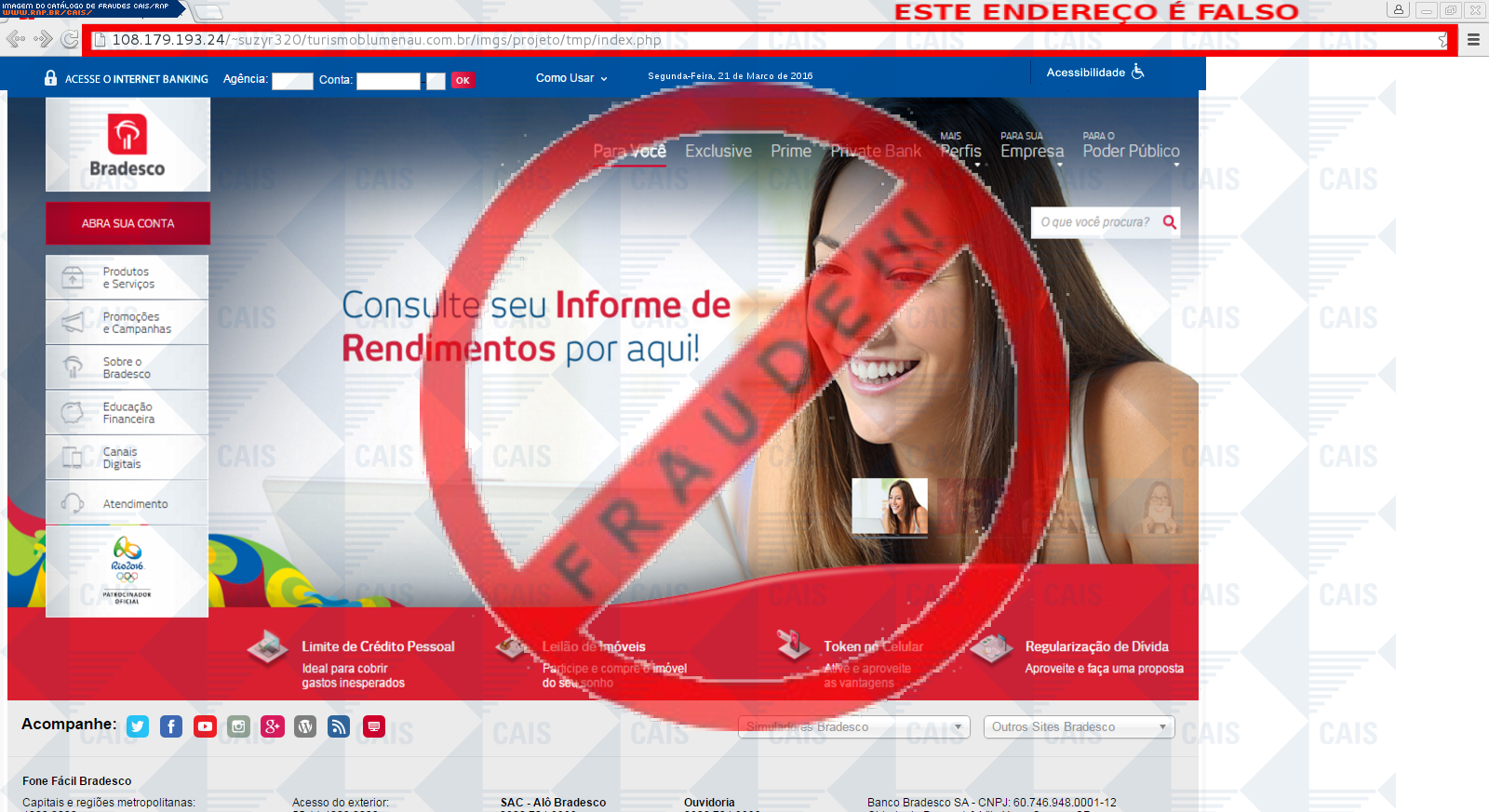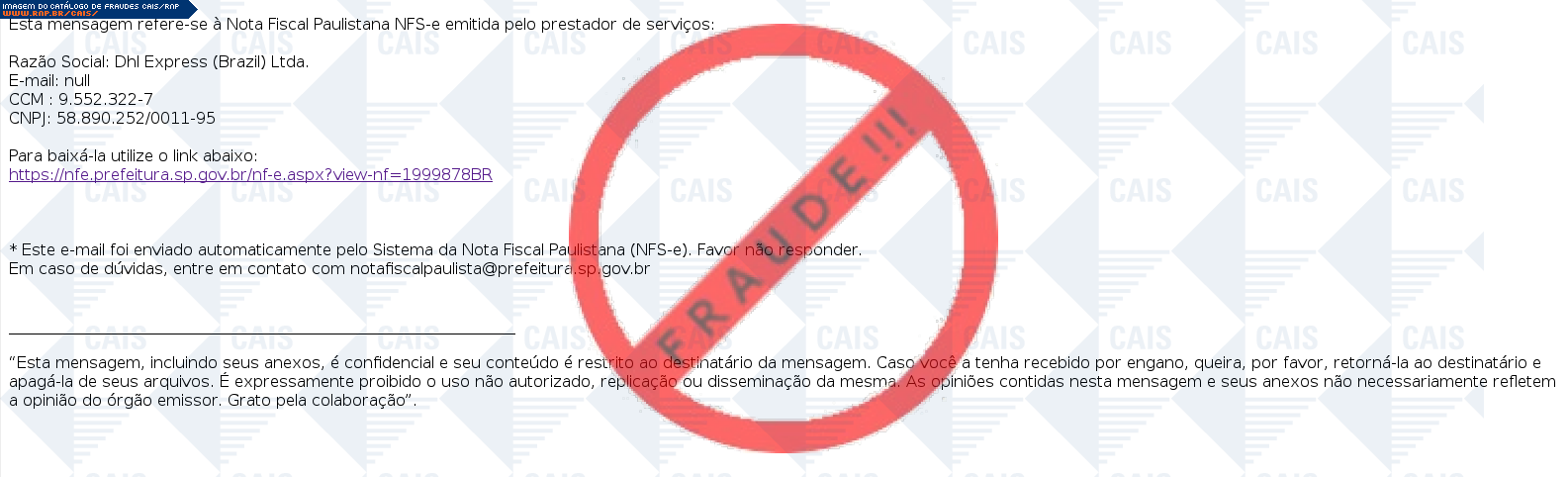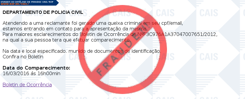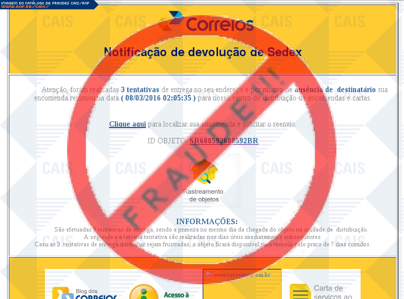 Esta página tem função informativa e educativa. Exibe uma coleção de imagens de phishing scam (fraudes eletrônicas) ou malware (código malicioso) veiculados por meio de spam (e-mail não-solicitado). Trata-se de conteúdo exemplificativo, não exaustivo, uma vez que não é possível contemplar todos os casos de fraudes existentes. Assim, caso você tenha conhecimento de um exemplar que não esteja aqui presente, isto não significa que não seja válido ou real. Inclusive incentivamos que você o envie para análise do CAIS para que, se for o caso, passe a integrar o nosso acervo.