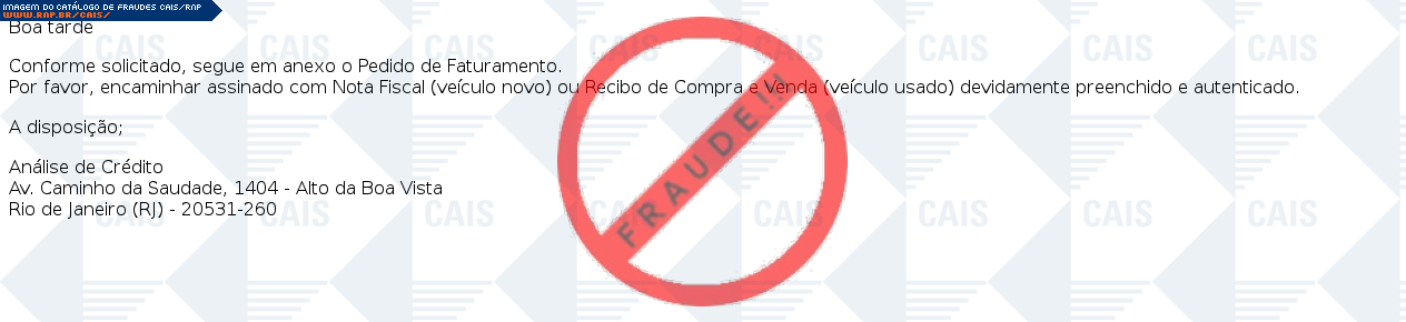 | tipo | FRAUDE - Pedido de faturamento | ID: 47161 |