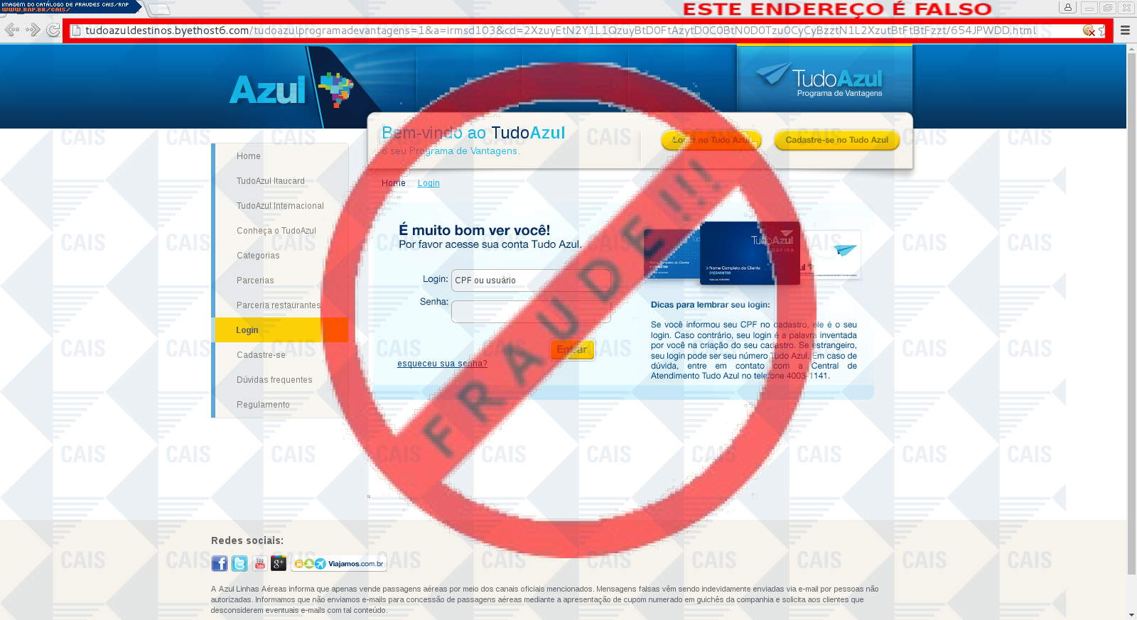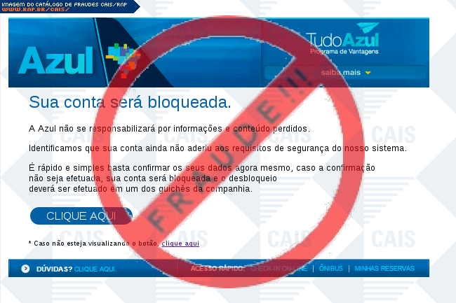 | comentário | O usuário recebe uma mensagem informando que sua conta na empresa aérea Azul será bloqueada sendo necessário fornecer algumas informações no link indicado, no entanto a página é falsa destinada a roubar os dados da vítima. | |