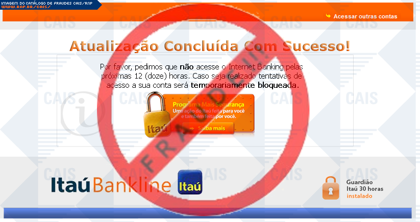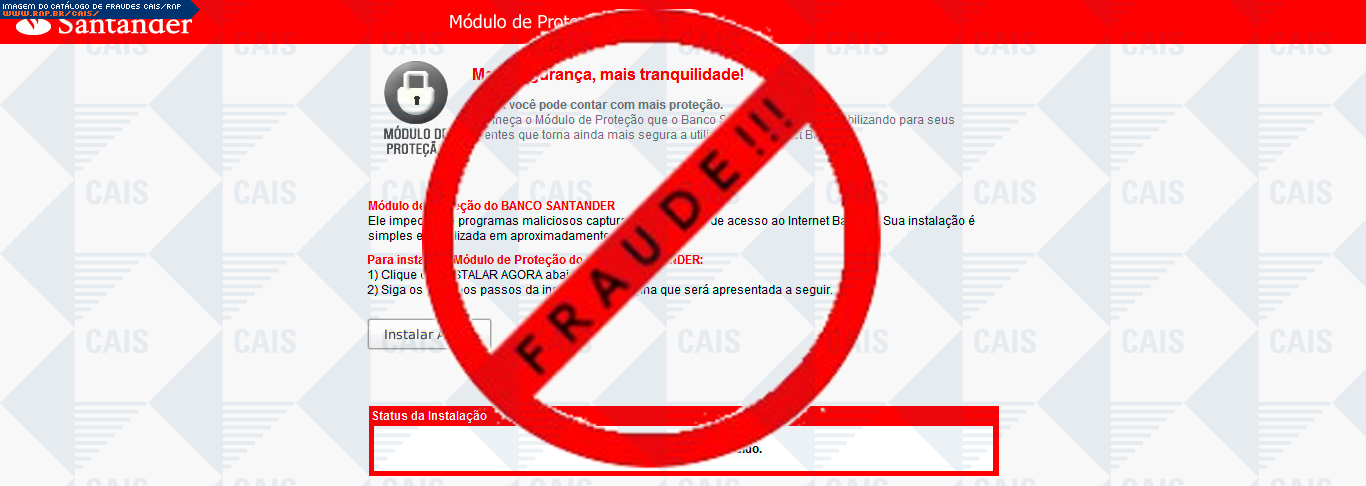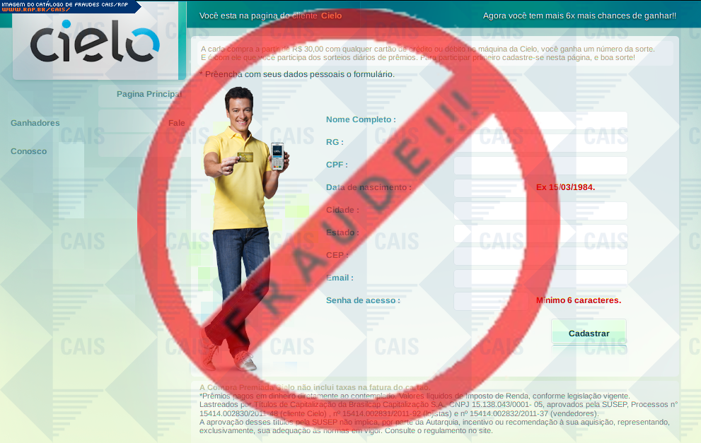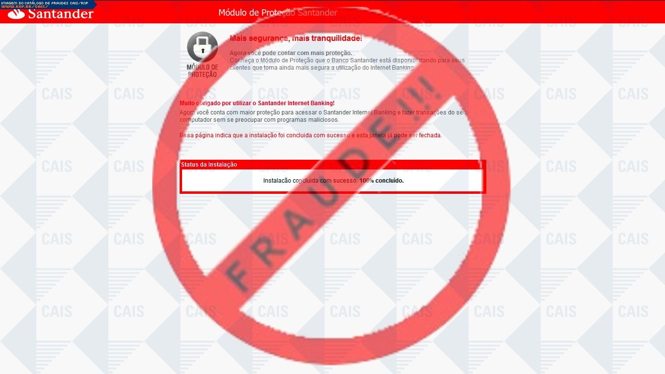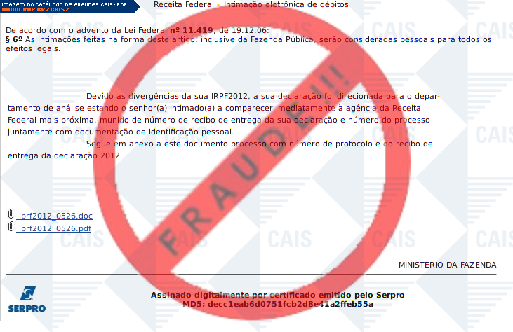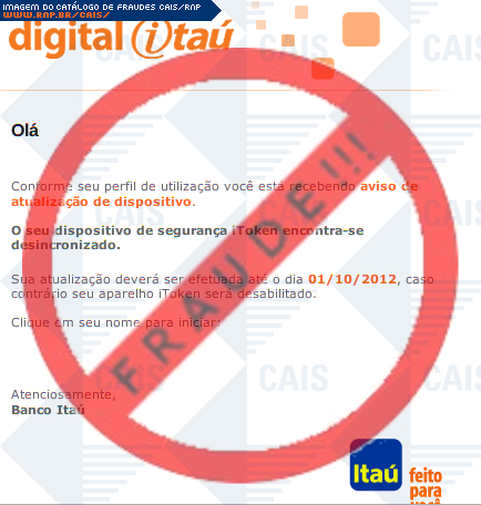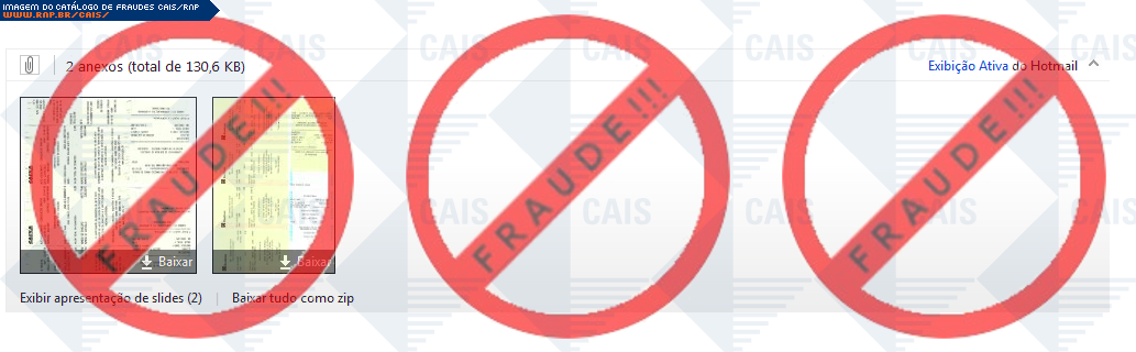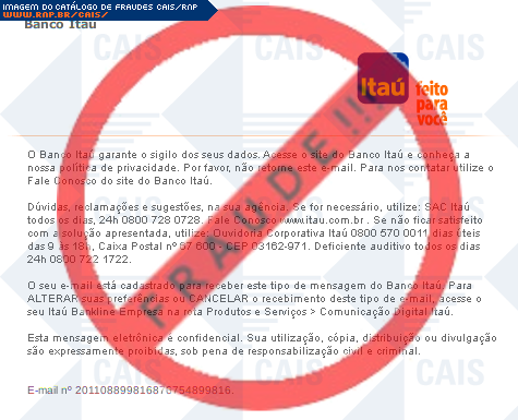 Esta página tem função informativa e educativa. Exibe uma coleção de imagens de phishing scam (fraudes eletrônicas) ou malware (código malicioso) veiculados por meio de spam (e-mail não-solicitado). Trata-se de conteúdo exemplificativo, não exaustivo, uma vez que não é possível contemplar todos os casos de fraudes existentes. Assim, caso você tenha conhecimento de um exemplar que não esteja aqui presente, isto não significa que não seja válido ou real. Inclusive incentivamos que você o envie para análise do CAIS para que, se for o caso, passe a integrar o nosso acervo.