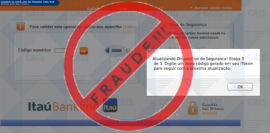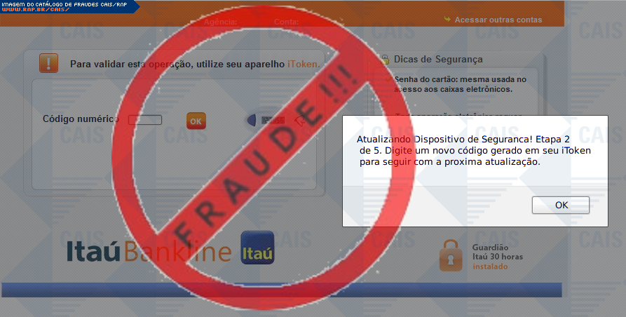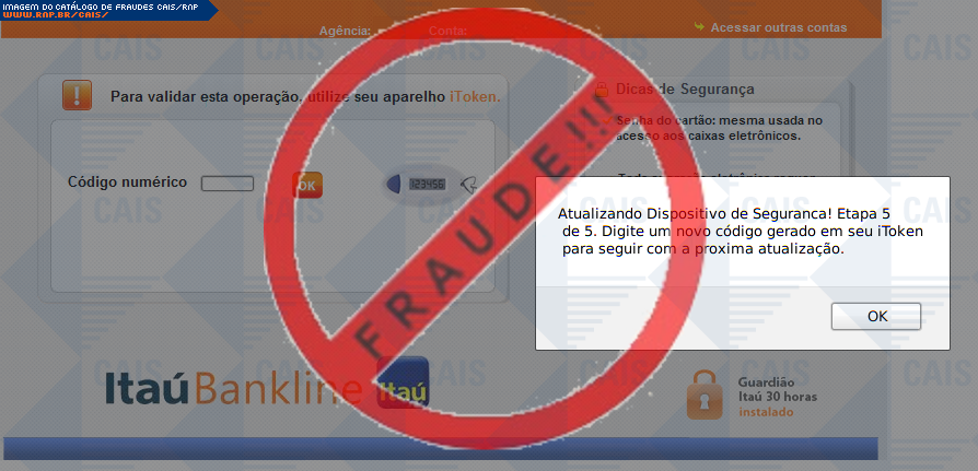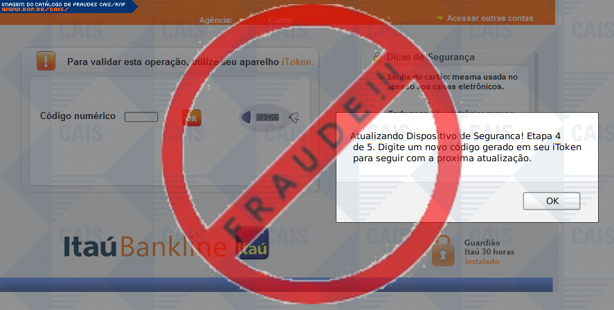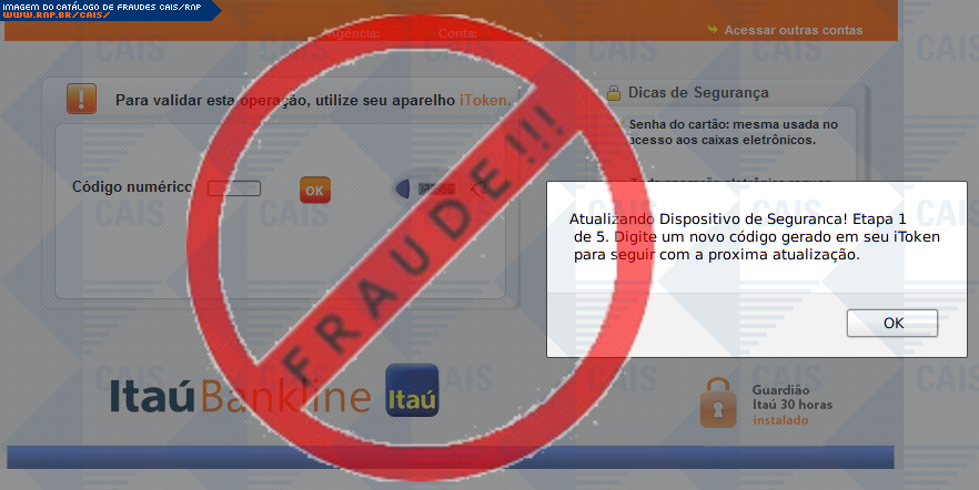 | comentário | Nessa ocorrencia há uma afirmação de o usuario deve atualizar o seu dispositivo itoken, porém trata-se de uma fraude. O fraudador utiliza uma pagina falsa na tentativa de adquirir os dados dos cartões de credito e conta corrente do cliente, afirmando que... (leia mais) | |
