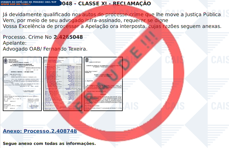 | comentário | O fraudador envia uma mensagem ao usuario solicitando que o mesmo se designe a processar uma apelação que move na Justiça e que maiores detalhes sobre o mesmo podem ser obtidos através de um link disponivel no corpo do email, mas trata-se de um malware de... (leia mais) | |
