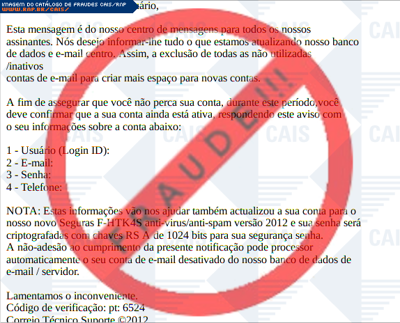 | comentário | Nessa fraude a ocorrencia é enviada uma mensagem ao usuario afirmando da necessidade de atualizar os seus dados de uma conta webmail, solicitando inclusive a senha de acesso a conta. Trata-se de uma fraude na tentativa de aquisição dos dados sensiveis do... (leia mais) | |