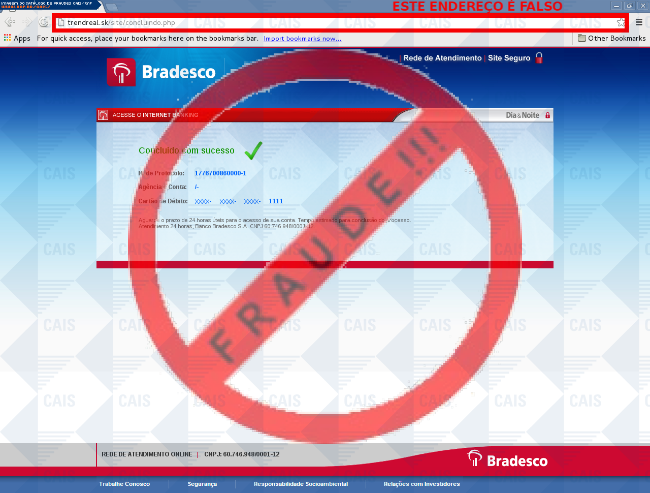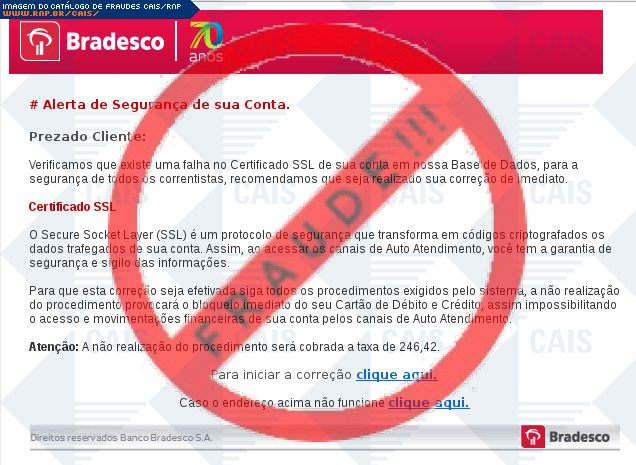 | comentário | O usuário recebe uma mensagem informando que há uma falha em seu certificado de segurança da sua conta Bradseco sendo necessário realizar uma correção no link disponível, porém a página é falsa criada para roubar os dados bancários da vítima. | |