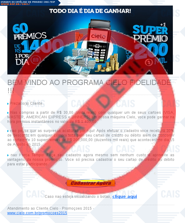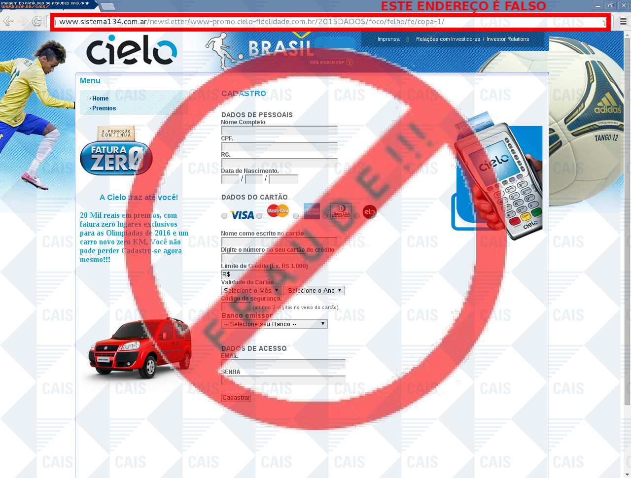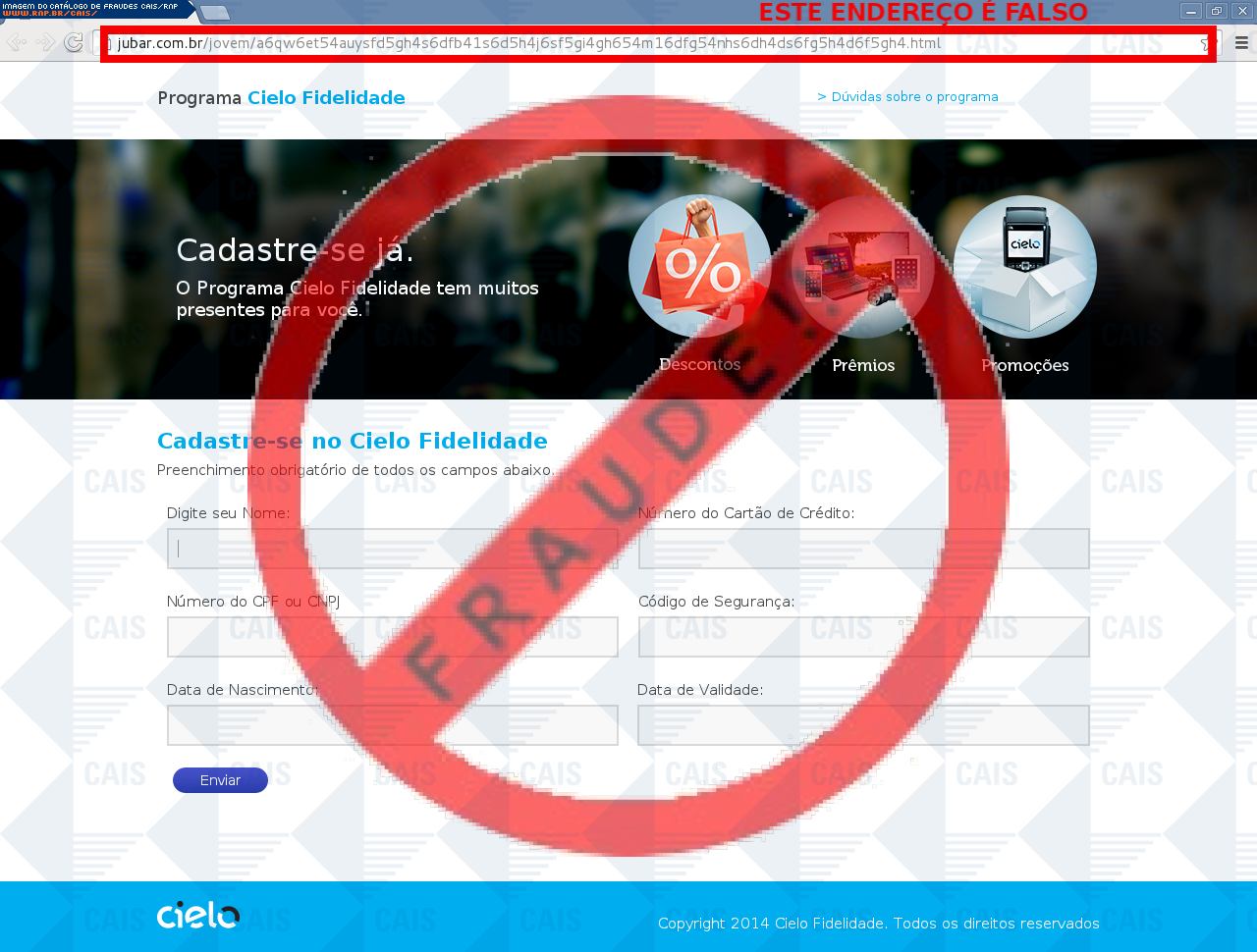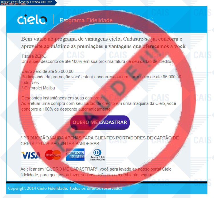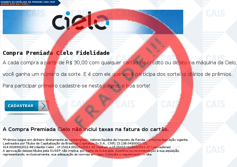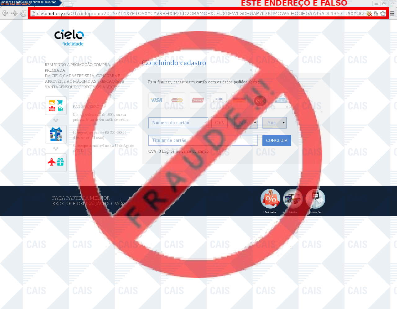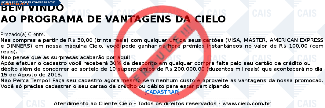 | comentário | A vítima recebe um e-mail informando sobre promoções relacionados a seu cartão Cielo sendo necessário realizar um cadastro, no entanto a página é falsa destinada a roubar os dados do cartão de crédito do usuário. | |